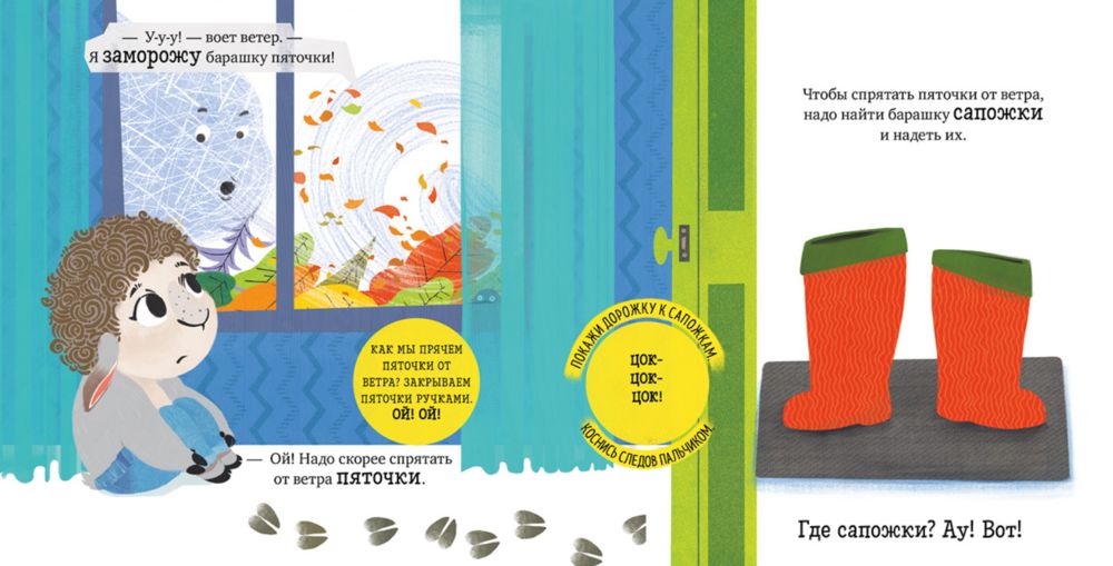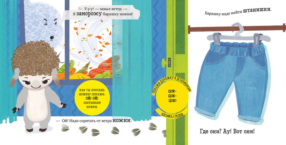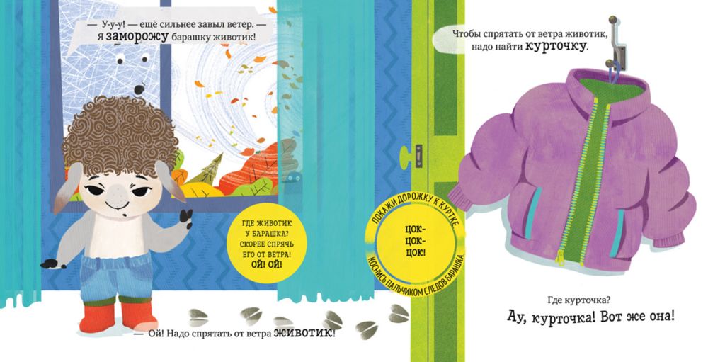 Маленький барашек Бяша любит играть и веселиться, а одеваться на прогулку ему совсем не нравится! Весёлая книга превратит этот важный процесс в увлекательную игру. Ребёнку предстоит спасти барашка Бяшу от сильного ветра, правильно подобрать одежду и поиграть с ним на улице.