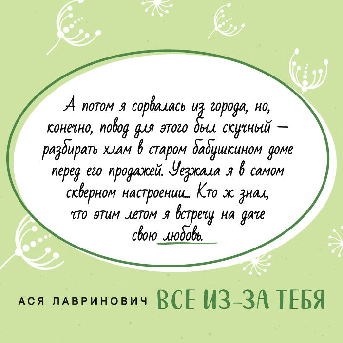 Прошло два года, и Маша уже забыла о нем. Этим летом она помогает бабушке на участке, а по вечерам купается в озере и ходит на свидания с Леней, очаровательным, умным и таинственным писателем.