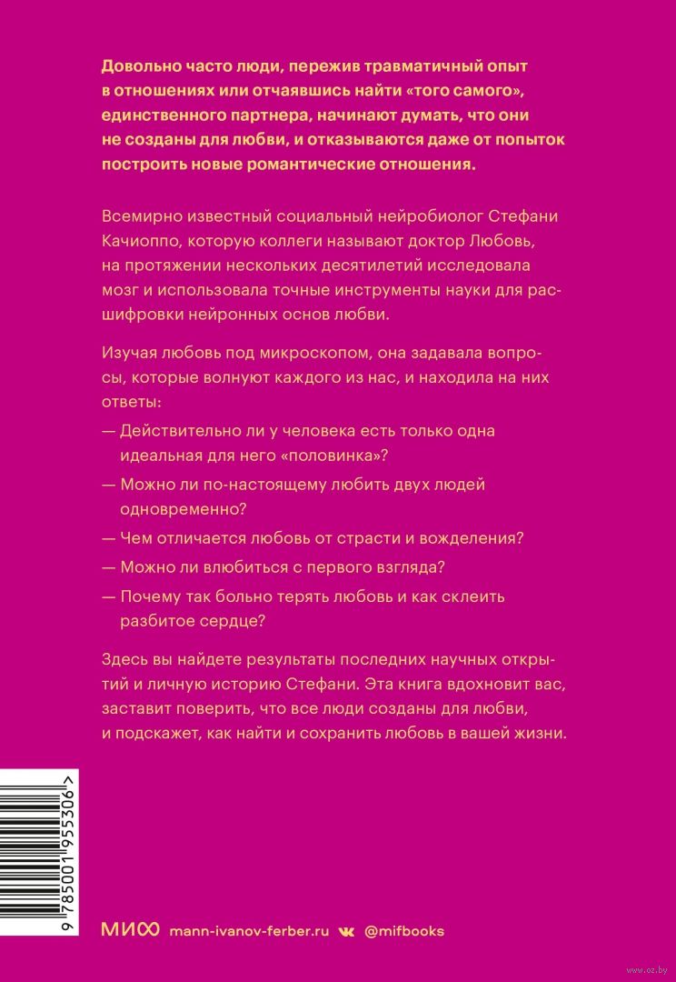 В своей нежной и одновременно научно обоснованной книге Стефани объясняет, как и почему мы влюбляемся, что делает любовь вечной и как пережить утраченную любовь - все это основано на передовых открытиях в области химии мозга и поведенческих наук, а также на ее опыте. Объяснения и советы переплетаются с трогательной личной историей: от знакомства с мужем, известным ученым Джоном Качиоппо, и неразрывной связи с ним до переживания горя в связи с уходом супруга от онкологии и исцеления. Опыт автора и ее работа обогащают друг друга, создавая уникальное сочетание науки и лирики.