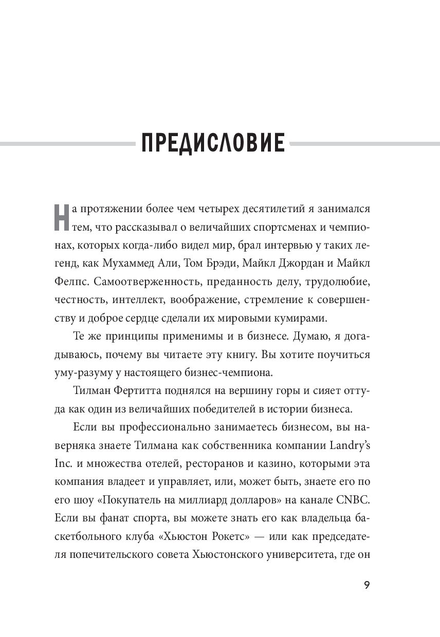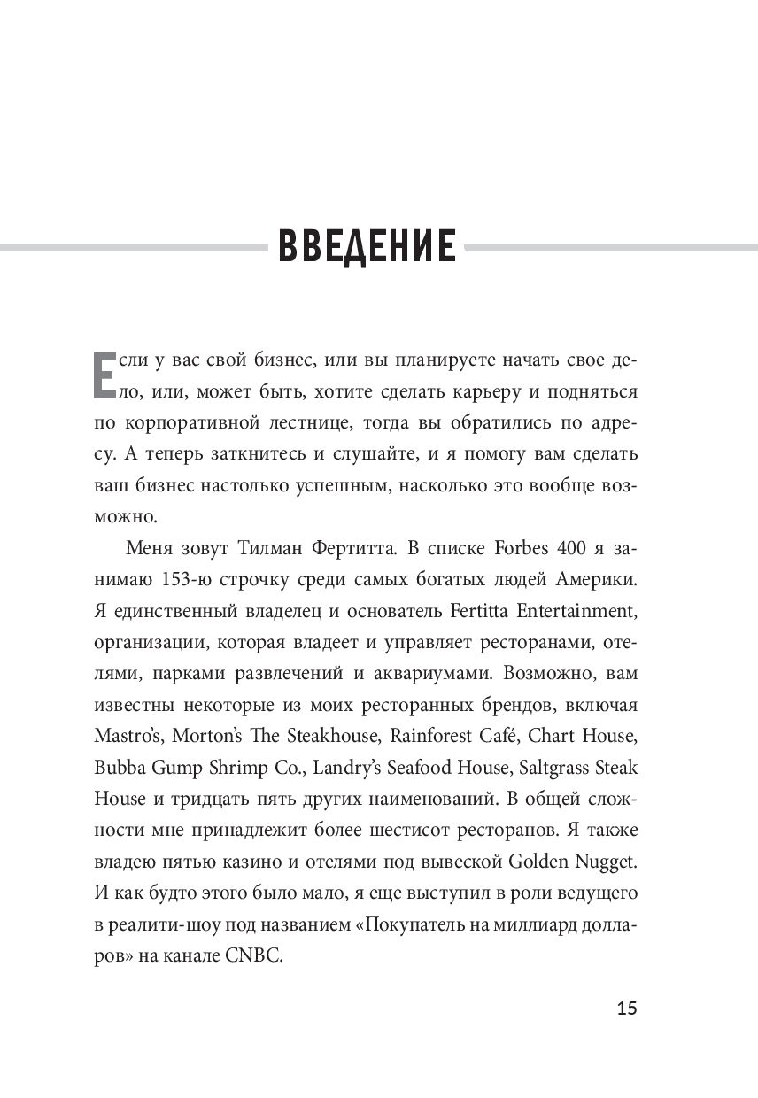 Тилман Фертитта основал ресторанно-гостиничную империю 30 лет назад, когда открыл своё первое заведение. Имея огромный опыт, он знает, с какими проблемами сталкивается большинство бизнесменов и какие подводные камни могут мешать достичь успеха. Многие годы он верен принципам, которые помогли ему расширить небольшой бизнес до уровня крупнейшей в США единоличной компании с оборотом более 4 миллиардов долларов, включающей в себя сотни ресторанов и казино. Фертитта также является единственным владельцем клуба НБА "Хьюстон Рокетс". В своей книге он делится ключевыми идеями, которые сделали всё это возможным.