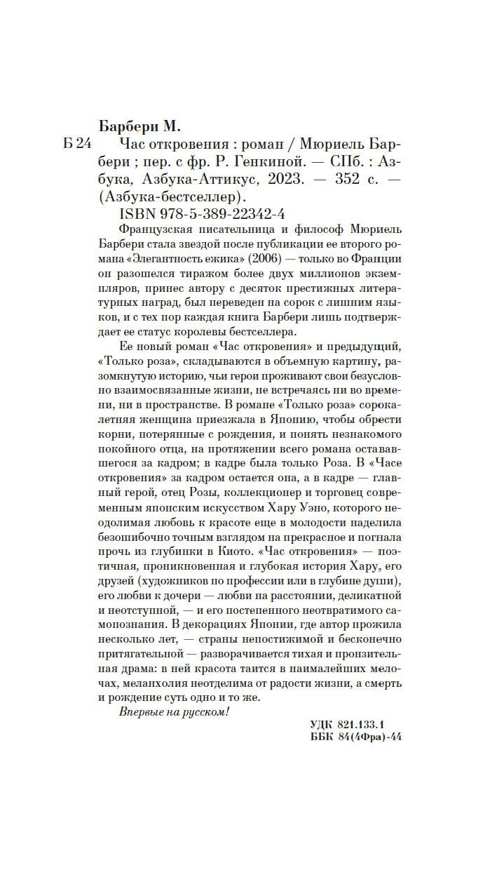 "Час откровения" – поэтичная, проникновенная и глубокая история Хару, его друзей (художников по профессии или в глубине души), его любви к дочери – любви на расстоянии, деликатной и неотступной, – и его постепенного неотвратимого самопознания. В декорациях Японии, где автор прожила несколько лет, – страны непостижимой и бесконечно притягательной – разворачивается тихая и пронзительная драма: в ней красота таится в наималейших мелочах, меланхолия неотделима от радости жизни, а смерть и рождение суть одно и то же.