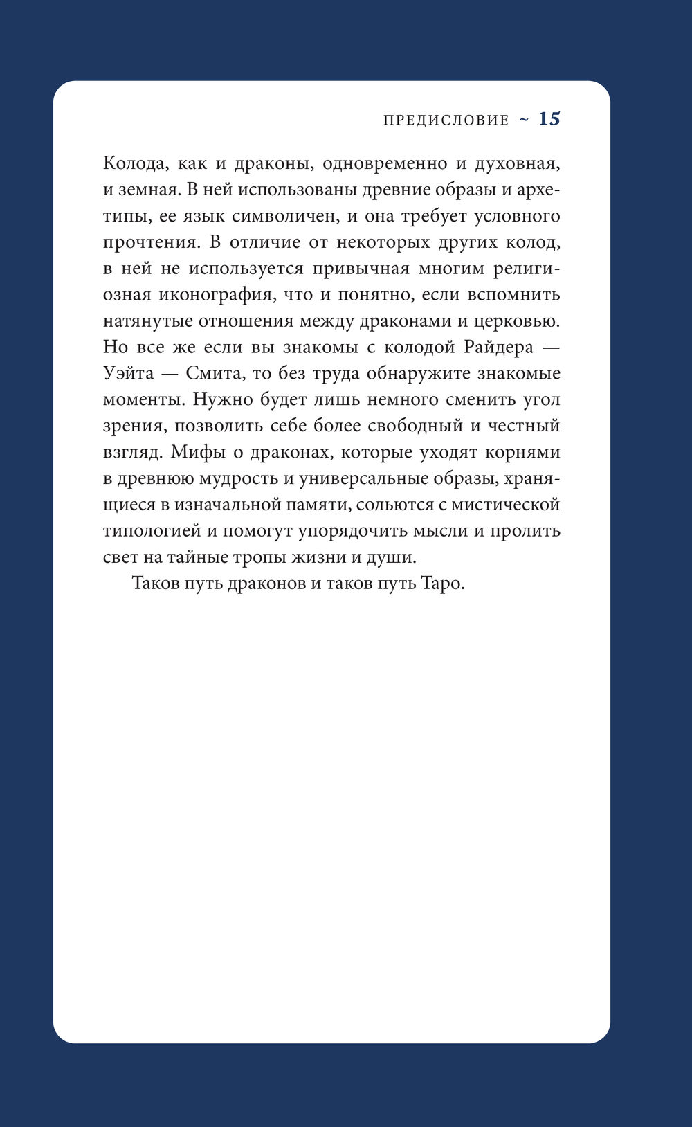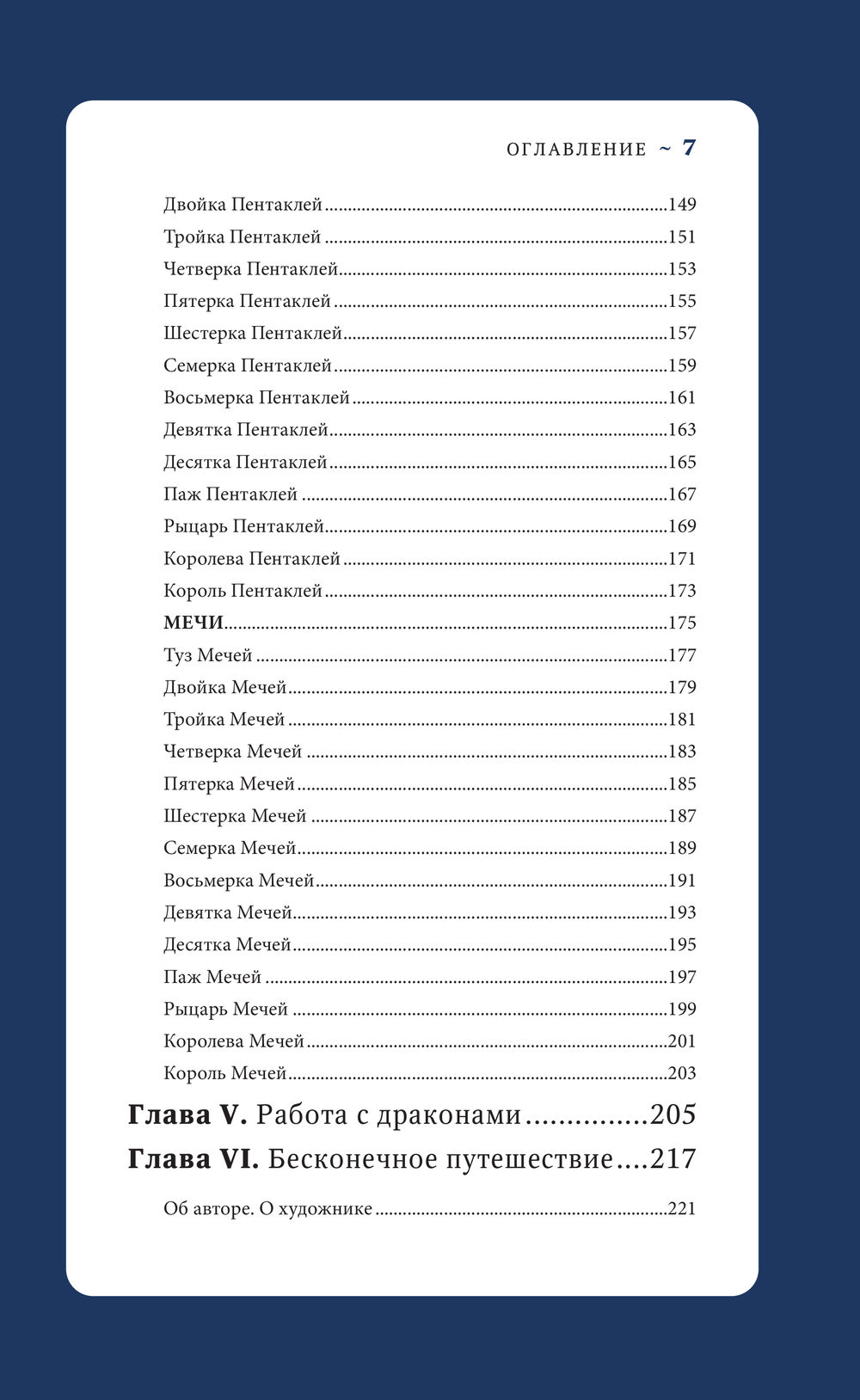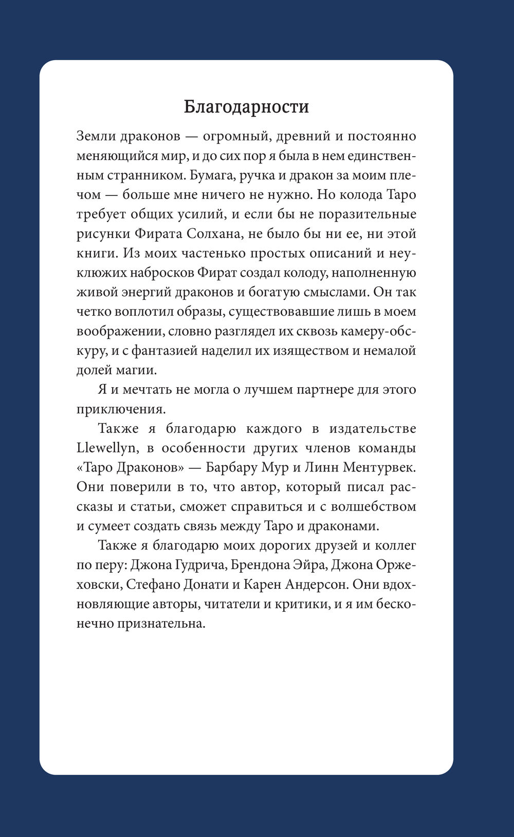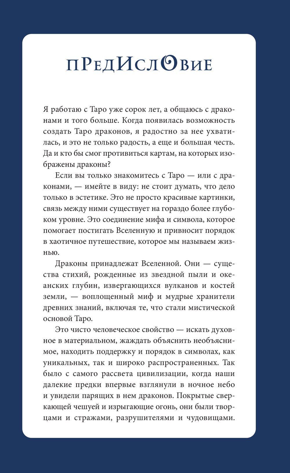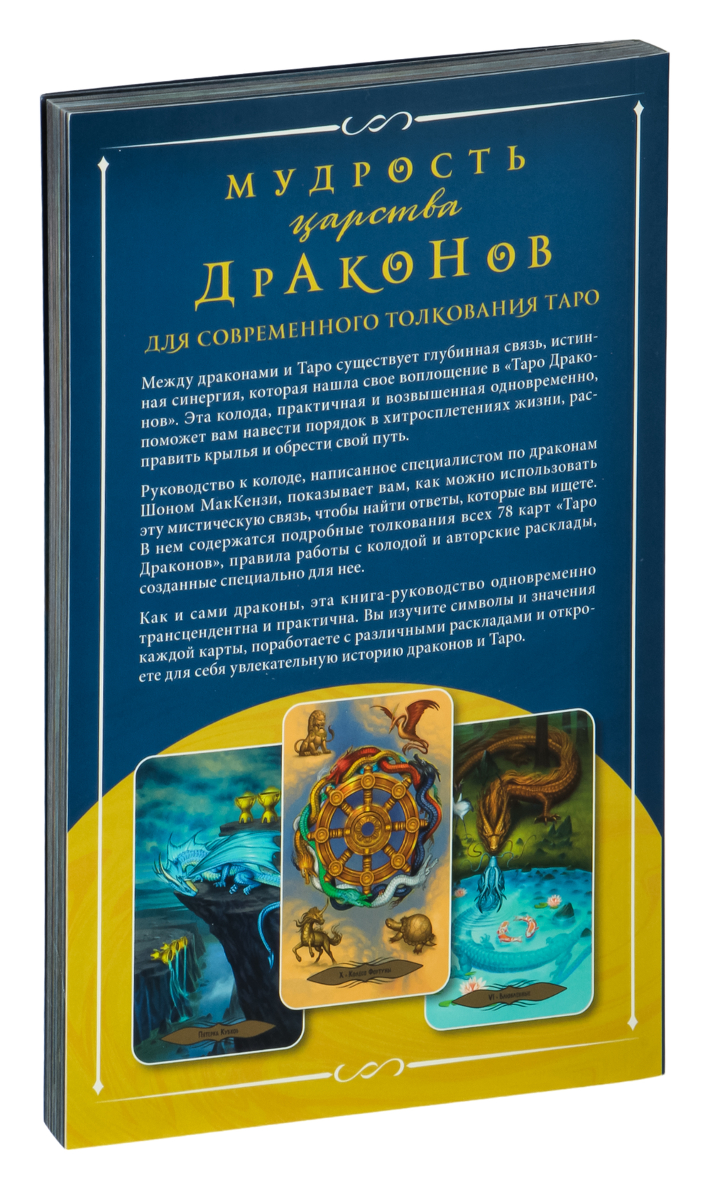 Руководство к колоде, написанное специалистом по драконам Шоном Маккензи, показывает вам, как можно использовать эту мистическую связь, чтобы найти ответы, которые вы ищете. В ней содержатся подробные толкования всех 78 карт "Таро Драконов", правила работы с колодой и авторские расклады, созданные специально для нее.