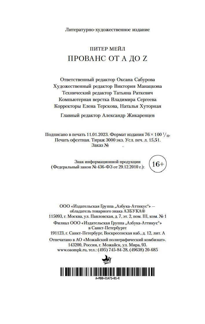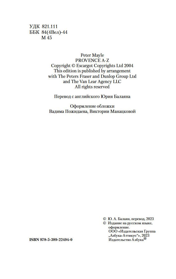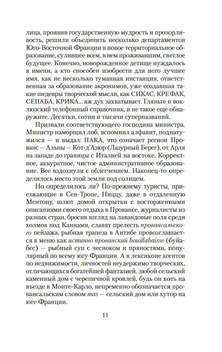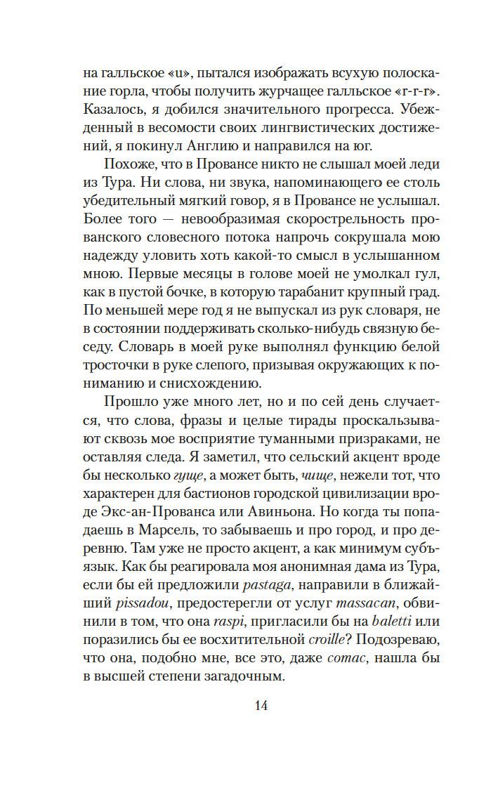 Разве можно рассказать о Провансе в одной книжке? Горы и виноградники, трюфели и дыни, традиции и легенды, святые и бестии... С чего начать, чем пренебречь? Серьезный автор наверняка сосредоточился бы на чем-то одном и сочинил бы солидный опус. К Питеру Мейлу это не относится. Любые сведения вызывают доверие лишь тогда, когда они получены путем личного опыта, – так считает автор. Но не только поиск темы гонит его в винные погреба, на оливковые фермы и фестивали лягушек. "Попутно я получая удовольствие, не спорю", – признается Мейл. Таким образом, руководствуясь по большей части собственным любопытством и личными слабостями, "легкомысленной пташкой" порхая с ветки на ветку, от одного вопроса к другому, Мейл создал весьма занимательную "коллекцию фактов и фактиков" о Провансе, райском уголке на земле, о котором автор пишет с неизменной любовью и юмором.