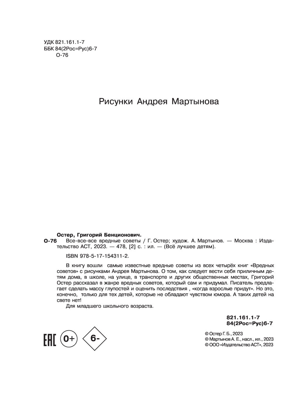 В книгу вошли самые известные вредные советы из всех четырёх книг "Вредных советов" с рисунками Андрея Мартынова. О том, как следует вести себя приличным детям дома, в школе, на улице, в транспорте и других общественных местах, Григорий Остер рассказал в жанре вредных советов, который сам и придумал. Писатель предлагает сделать массу глупостей и оценить последствия , "когда взрослые придут". Но это, конечно, только для тех детей, которые не обладают чувством юмора. А таких детей на свете нет!