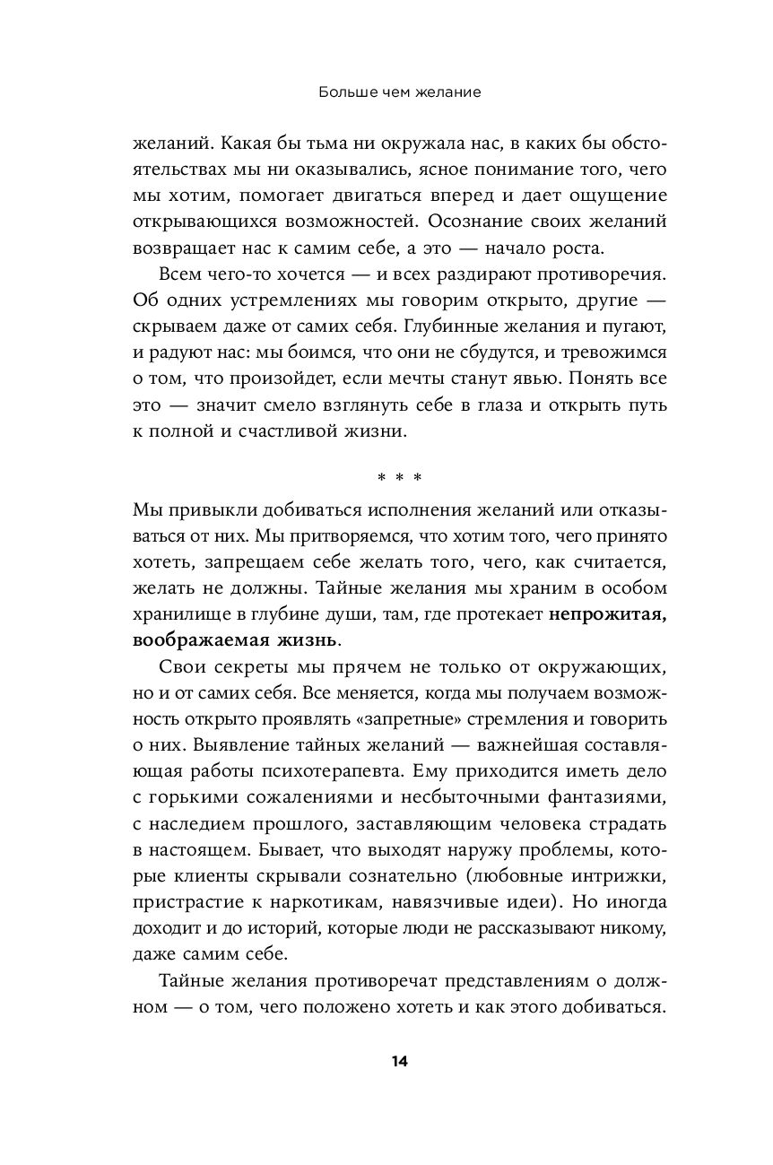 Шарлотта Фокс Вэбер известный психотерапевт, эксперт лондонской The School of Life предлагает нам задуматься, чего мы хотим на самом деле. Почему часто мы живем, исполняя чужие, навязанные нам желания и, только реализовав их, понимаем, что несчастливы? Автор выделяет 12 основных потаенных желаний, в которых людям сложно признаться самим себе: любить, контролировать, стремиться к пониманию, властвовать над другими, быть свободными, побеждать и другие. Шарлотта приоткрывает для нас секретные двери ее практики. В каждой главе автор дает яркий кейс своего клиента, с которым мы, если не идентифицируем себя, то как минимум готовы ему сопереживать. И через его историю лучше понять свою. Это профессиональный взгляд на то, что связывает всех нас, принятие глубокой важности понимания и формулирования наших желаний и практический набор инструментов для осознанной жизни.