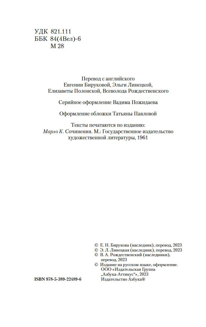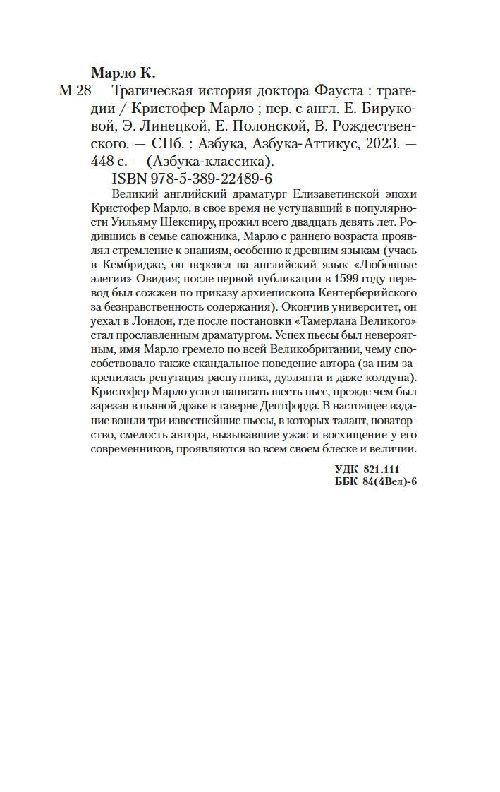 Великий английский драматург Елизаветинской эпохи Кристофер Марло, в свое время не уступавший в популярности Уильяму Шекспиру, прожил всего двадцать девять лет. Родившись в семье сапожника, Марло с раннего возраста проявлял стремление к знаниям, особенно к древним языкам (учась в Кембридже, он перевел на английский язык "Любовные элегии" Овидия; после первой публикации в 1599 году перевод был сожжен по приказу архиепископа Кентерберийского за безнравственность содержания). Окончив университет, он уехал в Лондон, где после постановки "Тамерлана Великого" стал прославленным драматургом. Успех пьесы был невероятным, имя Марло гремело по всей Великобритании, чему способствовало также скандальное поведение автора (за ним закрепилась репутация распутника, дуэлянта и даже колдуна). Кристофер Марло успел написать шесть пьес, прежде чем был зарезан в пьяной драке в таверне Дептфорда.