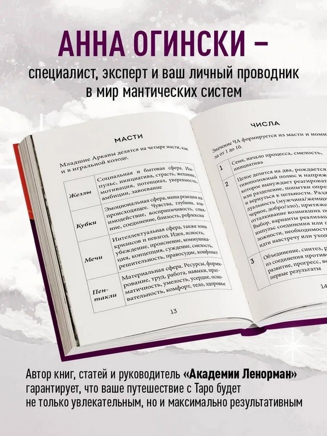 Простое и понятное руководство по картам Таро для начинающих от Анны Огински, руководителя учебного центра "Академия Ленорман", автора книг-бестселлеров. Здесь вы найдете все, чтобы познакомиться с картами Таро и самостоятельно приступить к гаданию: подробные толкования всех 78 карт колоды в прямом и перевернутом положении для разных сфер жизни, правила работы с колодой и базовые расклады, которые легко освоить и использовать.