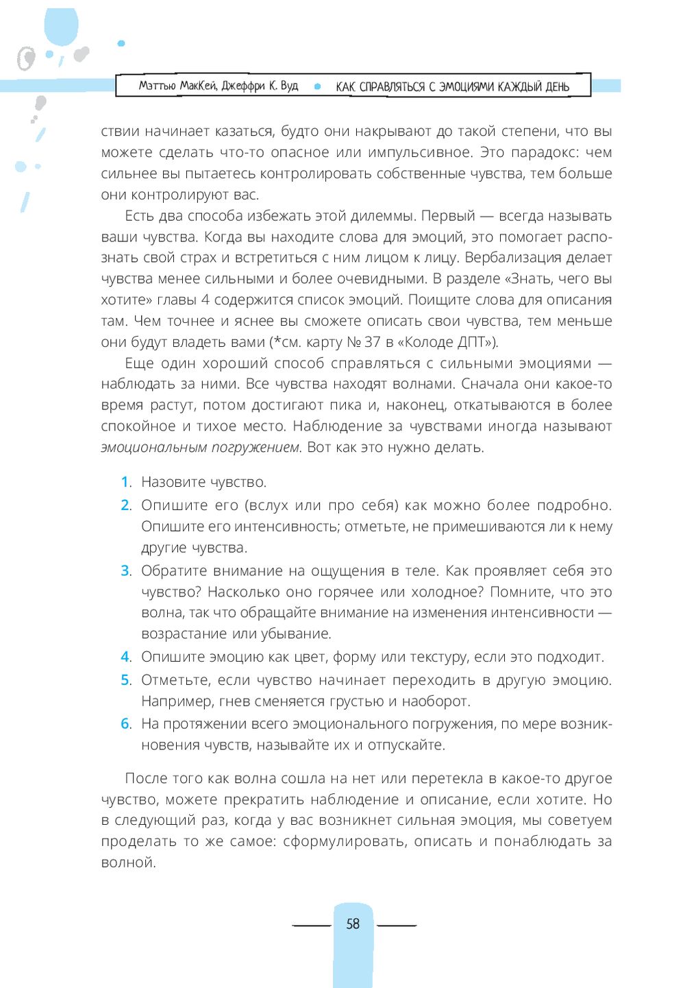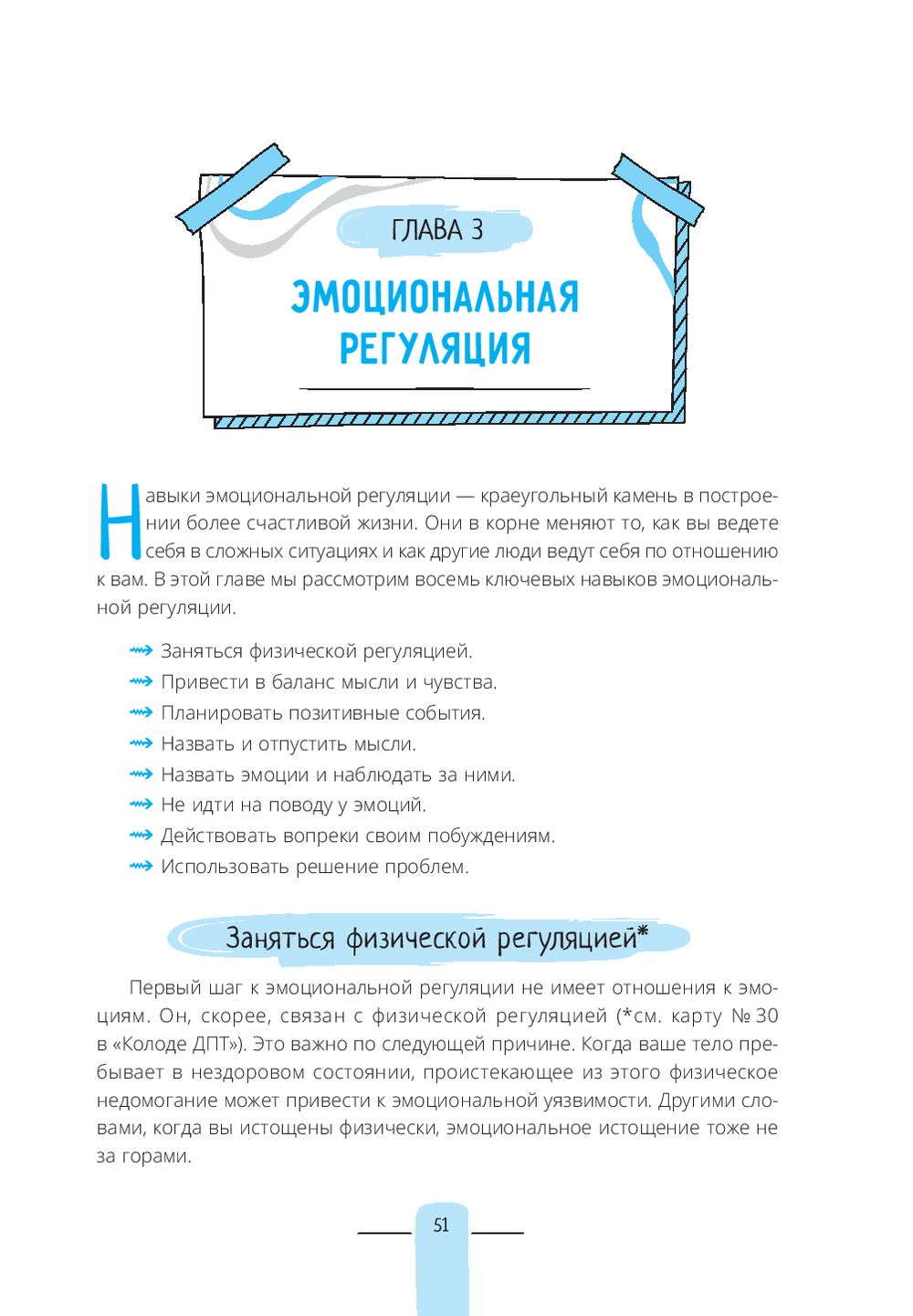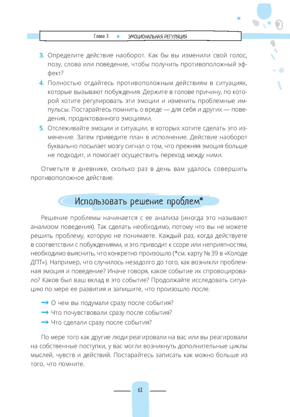 "Очень часто чувство – это всего лишь чувство, а не реальность. Иногда эмоции может вызвать случайная мысль, а иногда – ситуация, лишь слегка напоминающая о некоем событии из прошлого. Порой люди делают вещи, которые нас расстраивают, а порой разочаровывают нас. Случаются ситуации приятные, а иногда вызывающие раздражение, скуку и эмоциональную боль. Но очевидно, что нездоровая реакция на каждый эмоциональный опыт может быть вредной – как для вас, так и для вашего окружения. ДПТ успешно научила тысячи людей справляться с проблемами, связанными с сильными эмоциями. Однако она будет эффективна только в том случае, если вы практикуете навыки каждый день, а не просто прочтете о них".