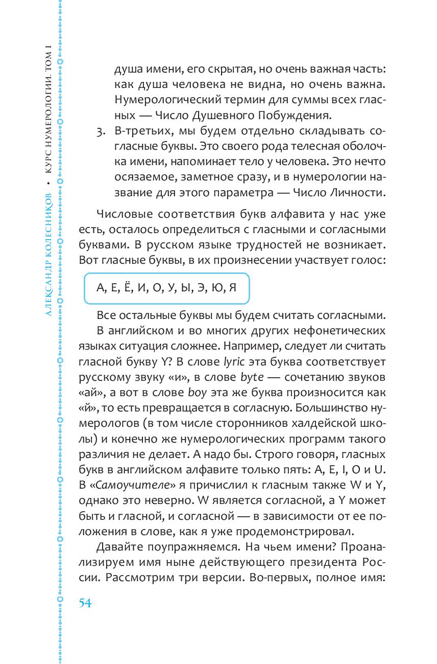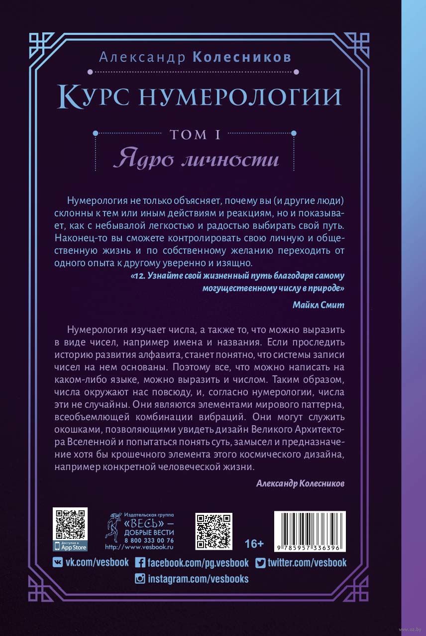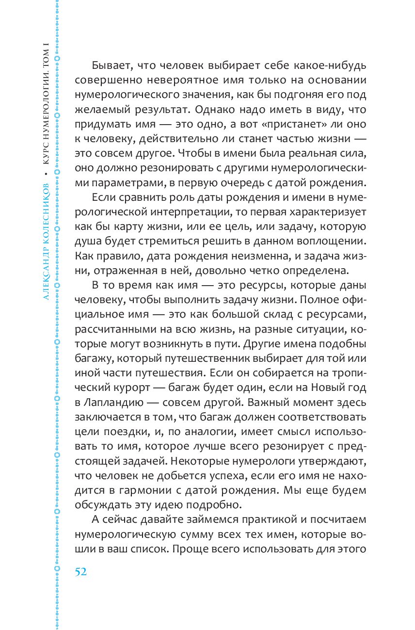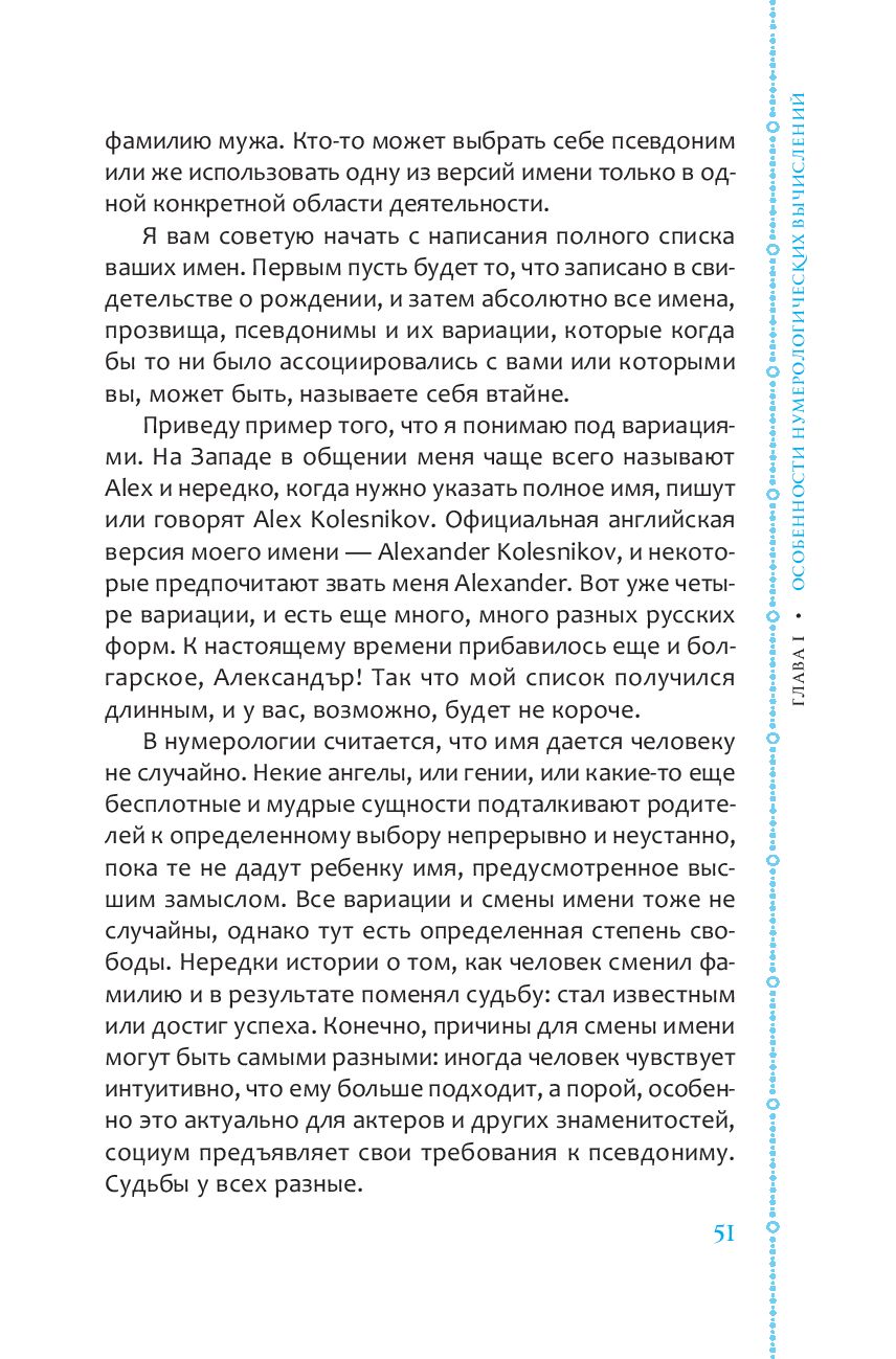 Важная особенность этой книги заключается в том, что автор не пытается сделать всю работу за вас, предлагая вам уже готовую информацию. По мнению Александра Колесникова, расчет для каждого человека индивидуален. Автор делится своим опытом, демонстрирует проверенные методы расчетов, помогает понять, какой из них лучше всего подходит вам, и дает советы о том, как стать самостоятельным практикующим нумерологом.
