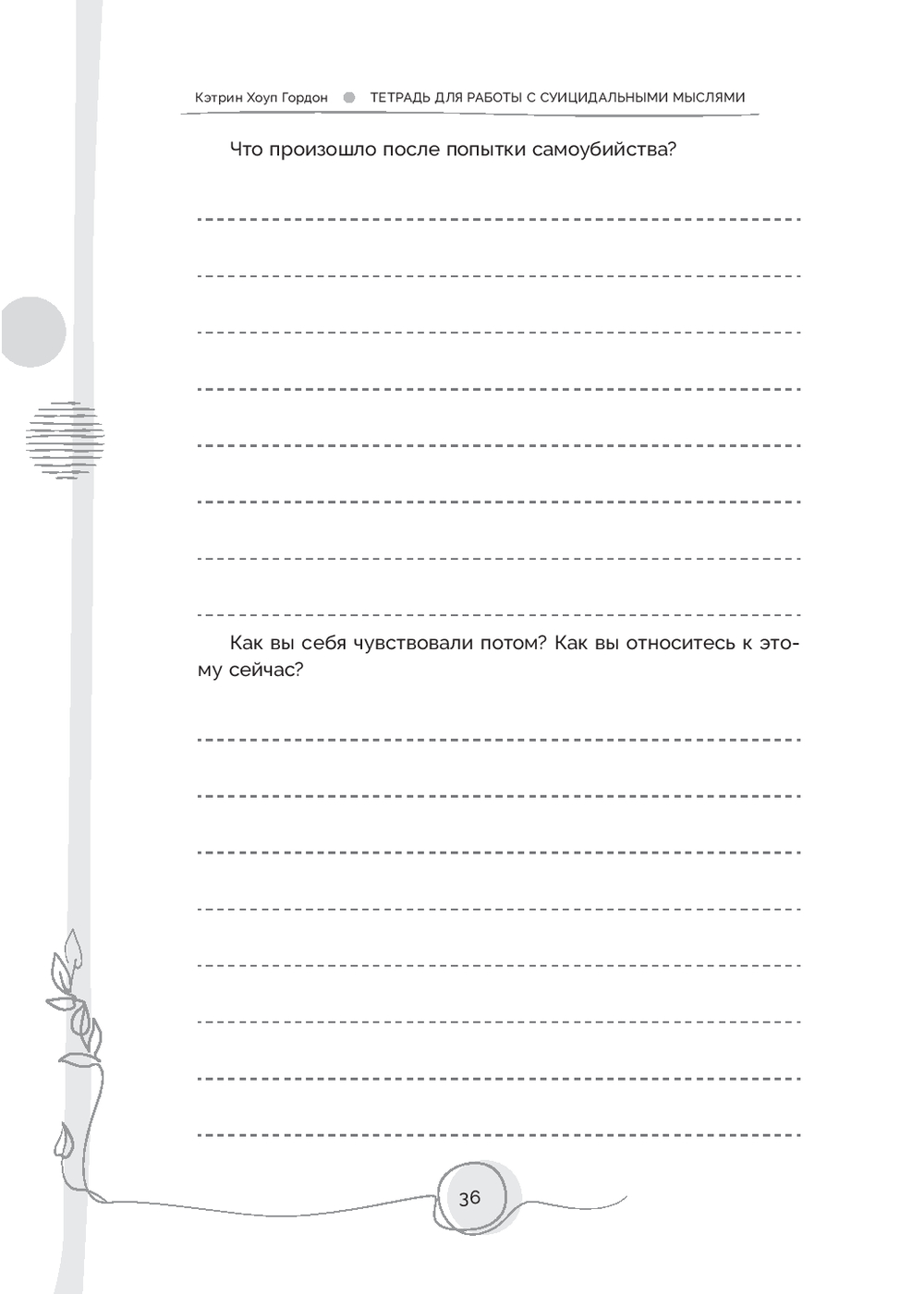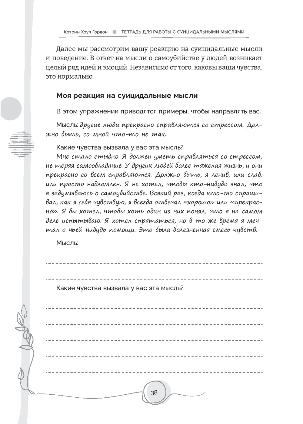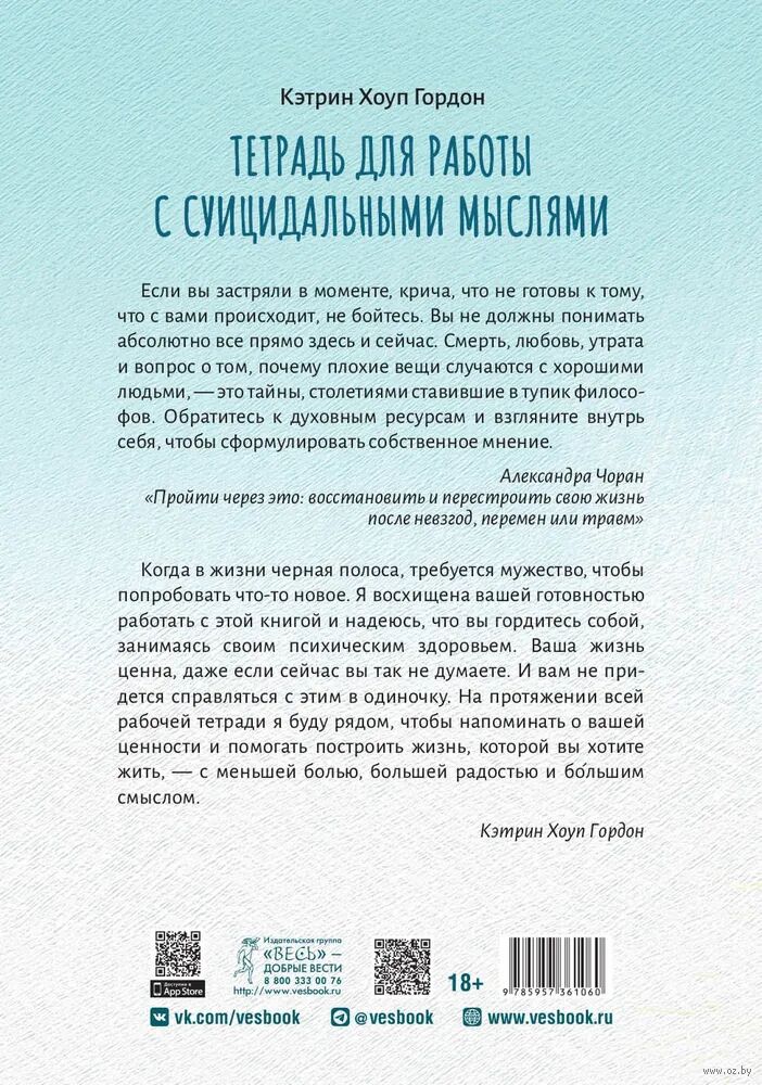 Эта книга – руководство к действию и попытка помочь людям в борьбе с суицидальными мыслями. Кэтрин Хоуп Гордон, основываясь на многолетней практике в качестве клинического психолога, создала тетрадь для работы с идеями о самоубийстве. Цель ее – доказать, что вы не одиноки в своей эмоциональной боли и если вам плохо, то это можно исправить. Доктор Гордон поможет вам обратить внимание на свое ментальное здоровье и обезопасить себя на время кризиса. Автор использует проверенные методы когнитивно-поведенческой терапии.