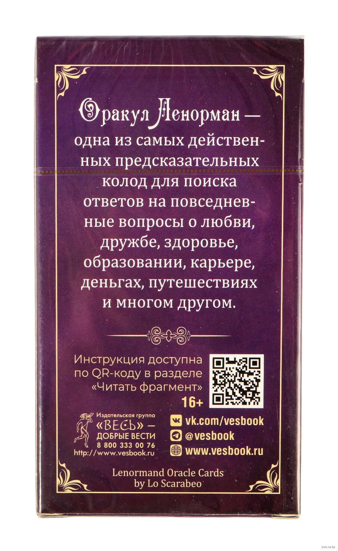 Спустя века оракул Ленорман остается одной из самых действенных предсказательных колод для поиска практических ответов на повседневные вопросы о любви, дружбе, здоровье, образовании, карьере, деньгах, путешествиях и многом другом.