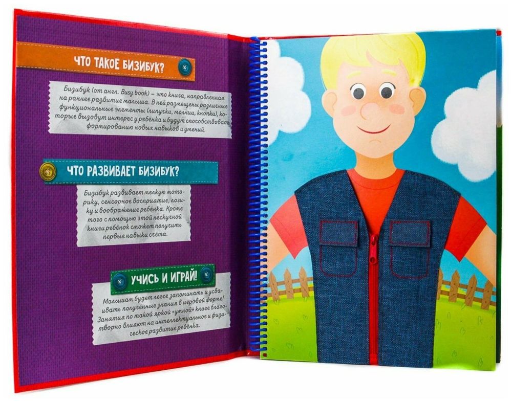 Бизибук (от англ. Busy book) – это книга, направленная на раннее развитие малыша. В ней размещены различные функциональные элементы (липучки, молнии, кнопки), которые вызовут интерес у ребёнка и будут способствовать формированию новых навыков и умений.