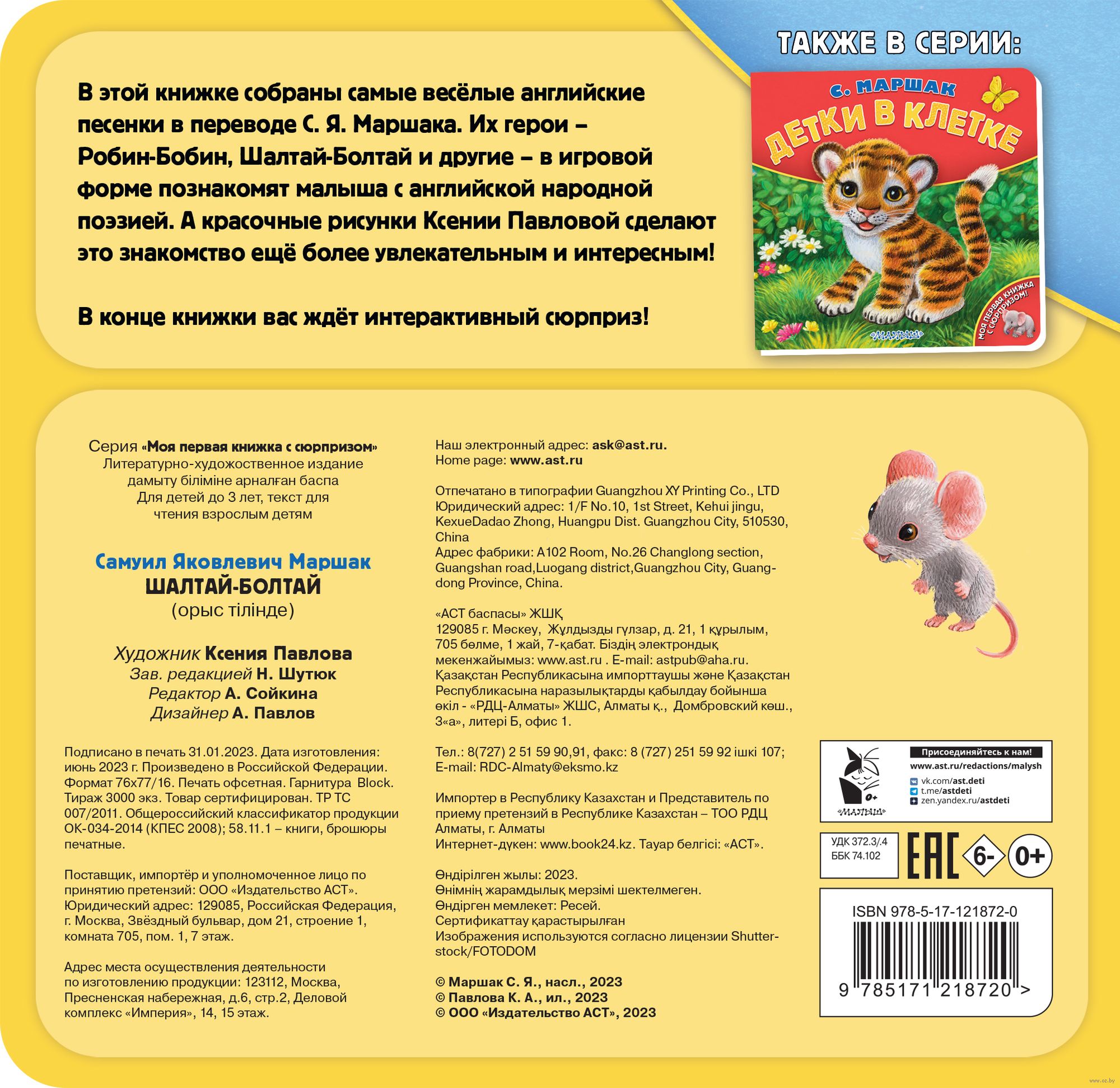 В этой книжке собраны самые весёлые английские песенки в переводе С. Я. Маршака. Их герои – Робин-Бобин, Шалтай-Болтай и другие – в игровой форме познакомят малыша с английской народной поэзией. А красочные рисунки Ксении Павловой сделают это знакомство ещё более увлекательным и интересным! В конце книжки вас ждёт интерактивный сюрприз!