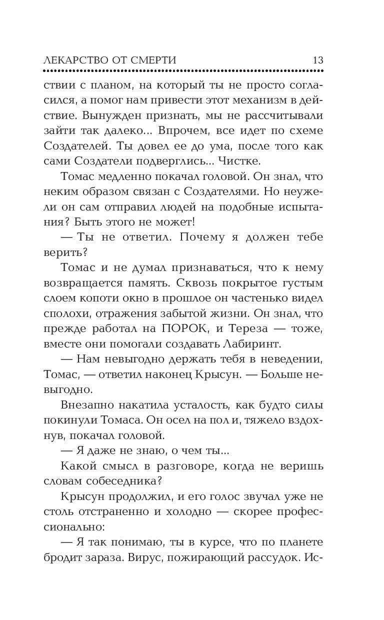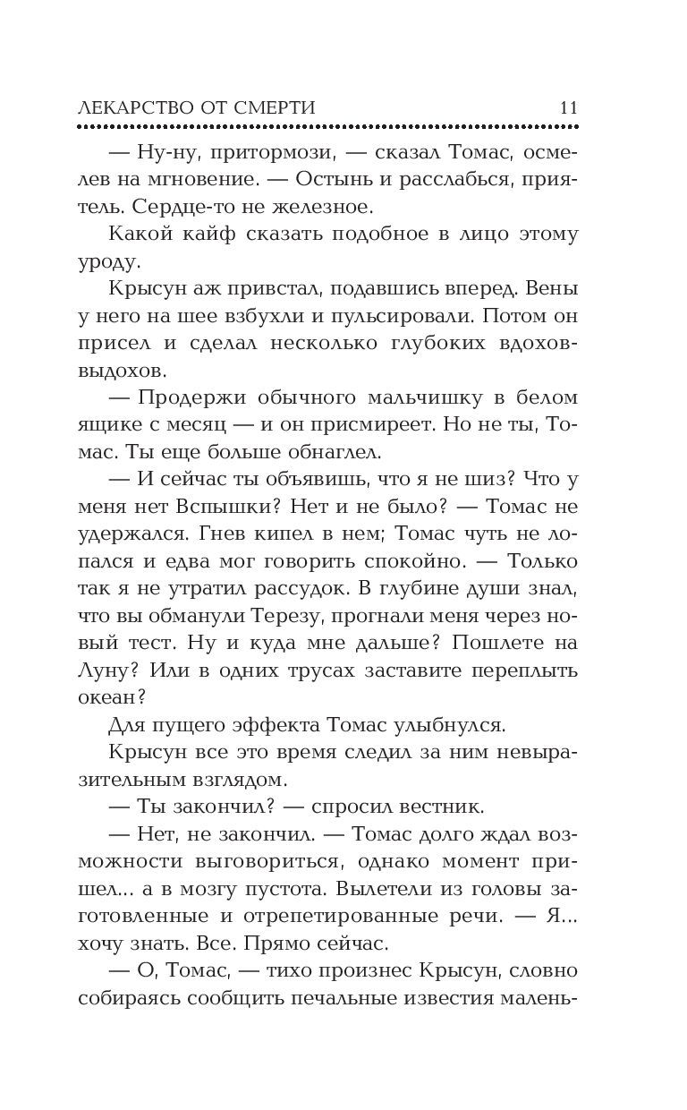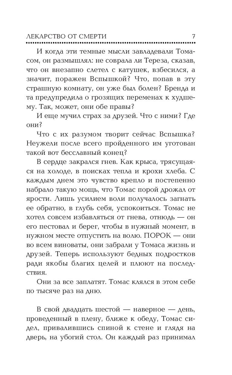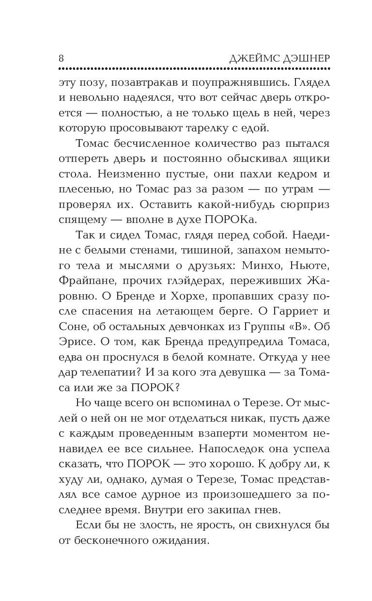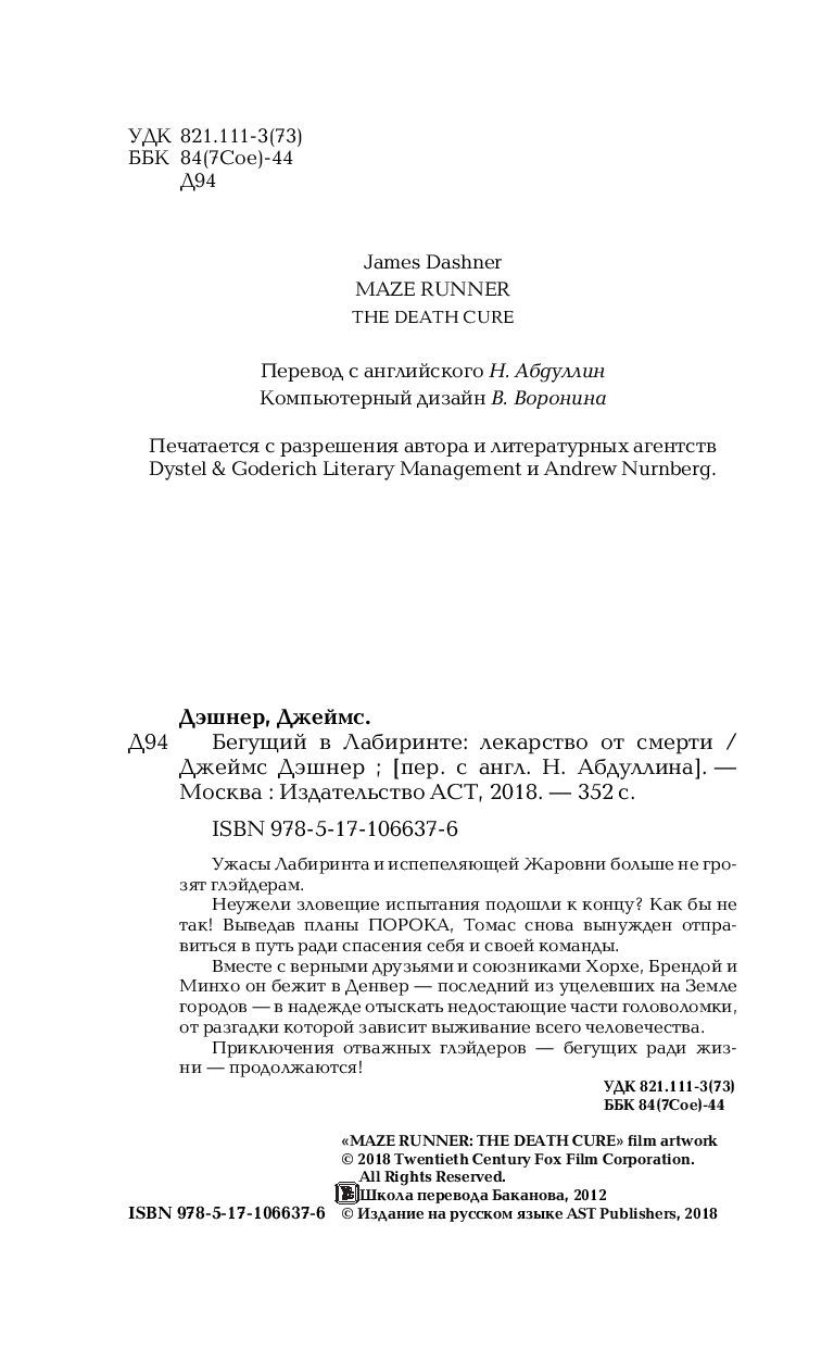 Вместе с верными друзьями и союзниками Хорхе, Брендой и Минхо он бежит в Денвер – последний из уцелевших на Земле городов – в надежде отыскать недостающие части головоломки, от разгадки которой зависит выживание всего человечества.