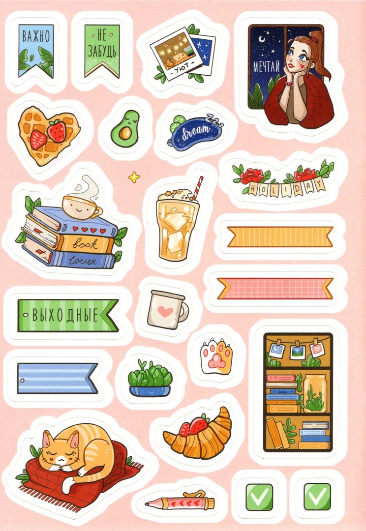 Стикербук станет отличным помощником в планировании! Наклейки позволят расставить акценты на странице именно так, как нужно тебе. Внутри есть наклейки с названиями месяцев, с пометками о срочности и важности дел, а также много симпатичных стикеров, которыми приятно украсить свой точкабук.