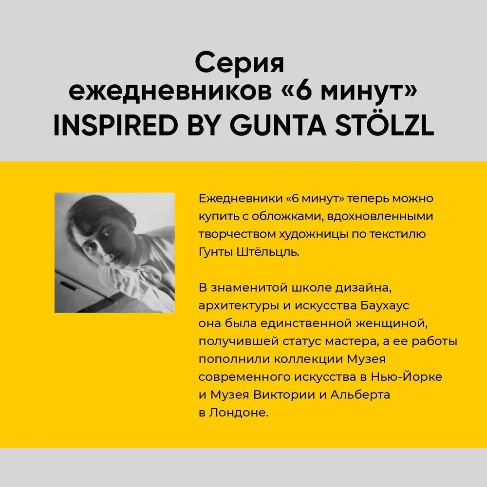Теперь ежедневник выходит в новом оформлении обложек, вдохновленном творчеством художницы по текстилю Гунты Штёльцль. В Баухаусе, знаменитой школе дизайна, архитектуры и искусства XX века, она была единственной женщиной-преподавателем и женщиной-мастером. Гунта сделала ткацкую мастерскую одним из самых успешных отделений школы, ее работы представлены в Музее современного искусства в Нью-Йорке и Музее Виктории и Альберта в Лондоне.