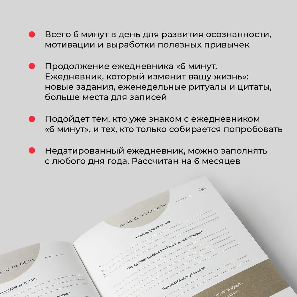 Подойдет тем, кто уже знаком с первым изданием и хочет продолжить заполнять ежедневник в новом формате, а также тем, кто только начинает знакомиться с Принципом 6 минут.