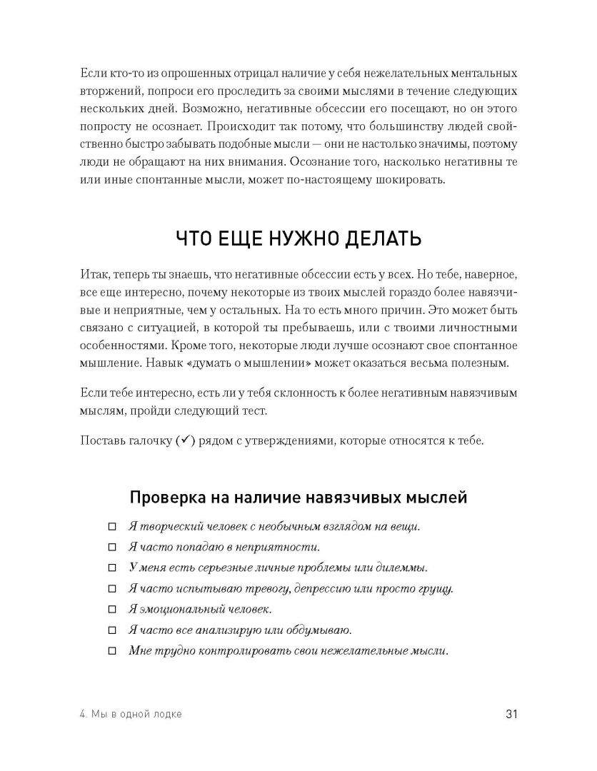 Эта книга поможет подросткам, у которых есть нежелательные, тревожные, расстраивающие или странные мысли, от которых невозможно избавиться. Часто подростки думают, что такие переживания указывают на ненормальность – и эта мысль пугает их еще больше. С помощью этой книги читатели узнают, как дистанцироваться от того, что вызывает приступы тревоги и депрессии и, в результате, улучшить свою жизнь шаг за шагом.