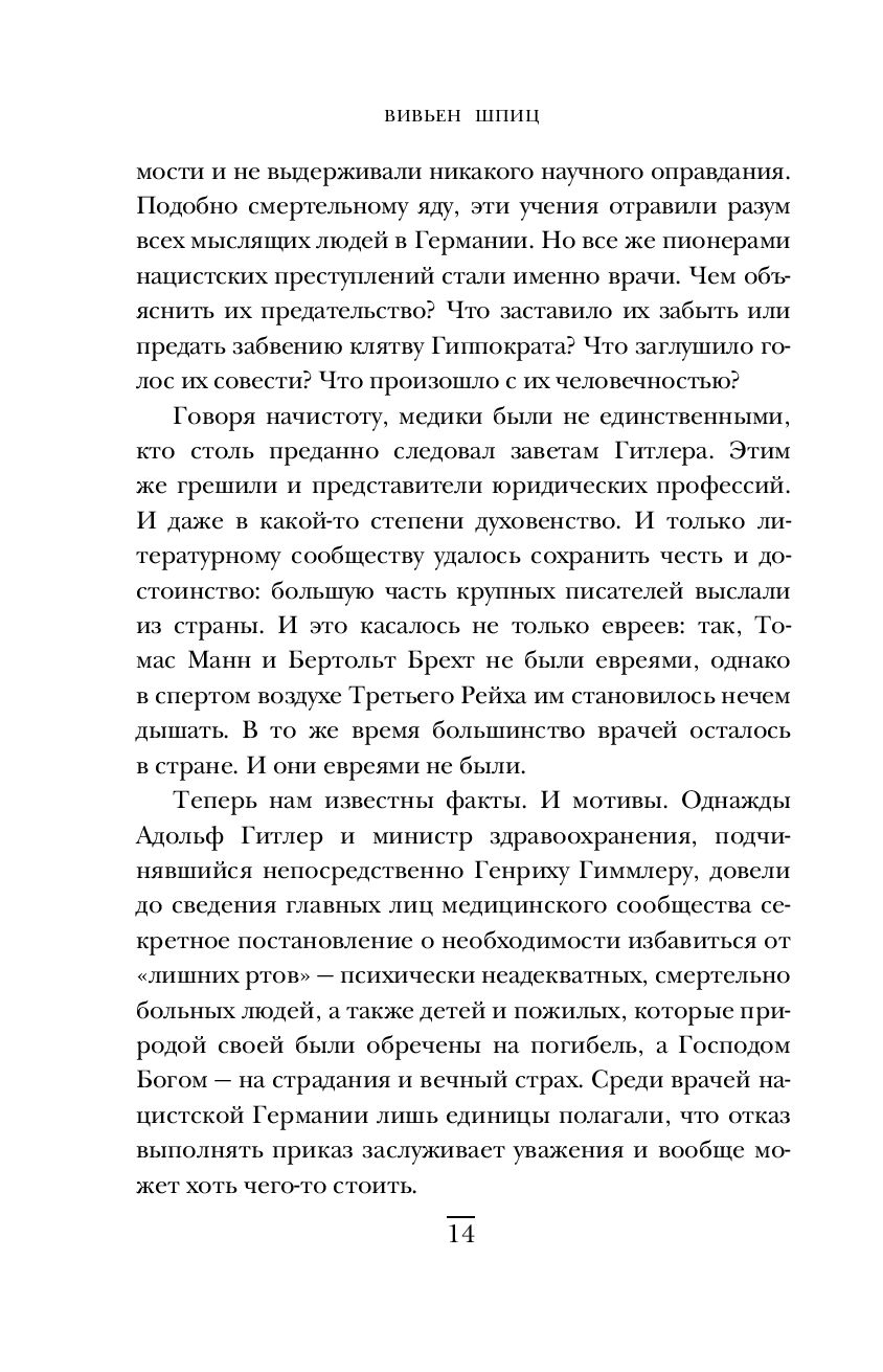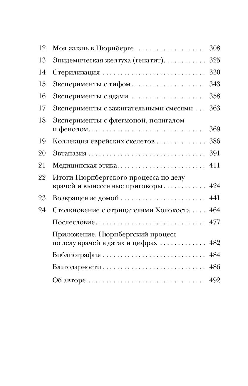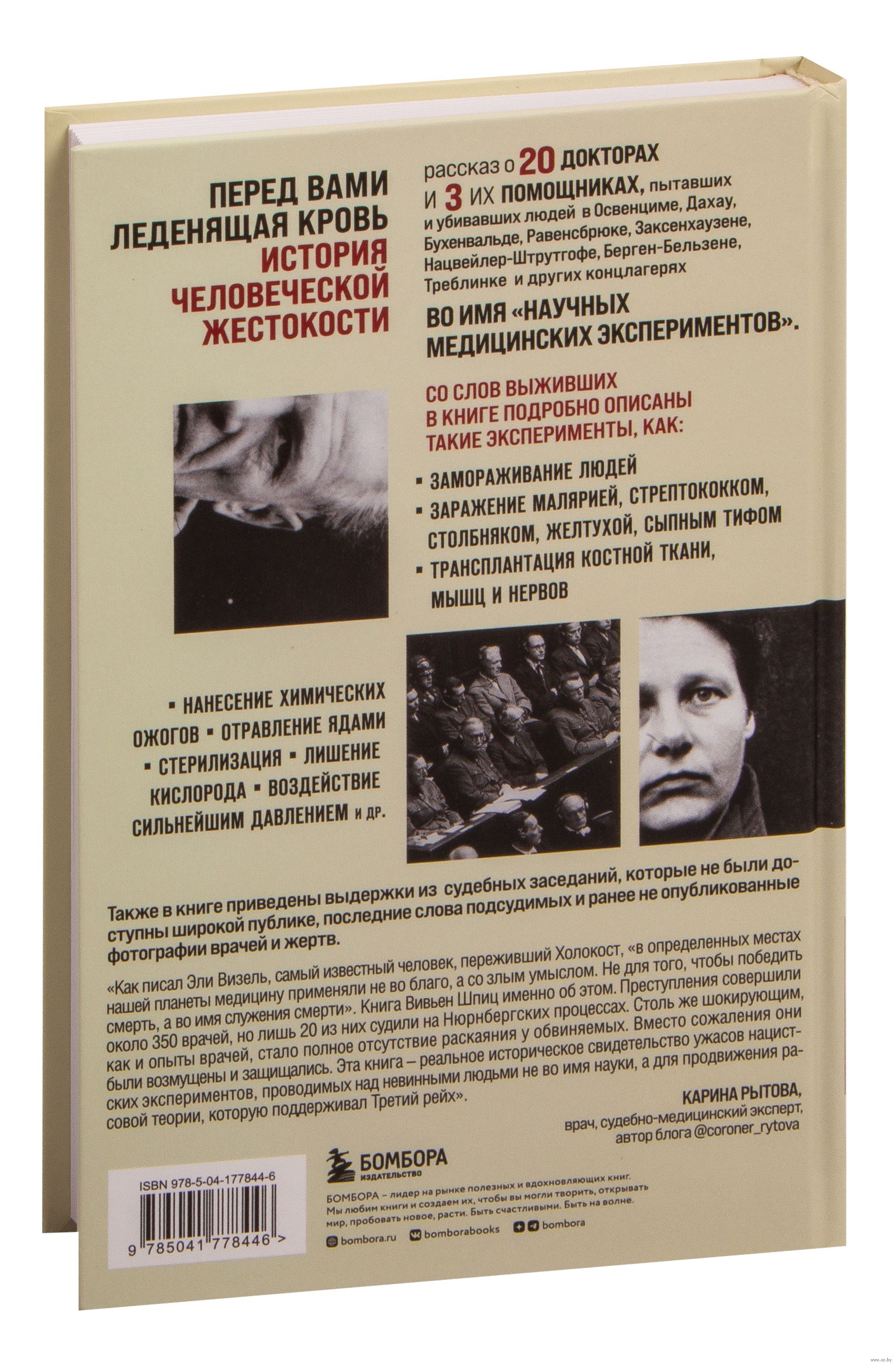 Эта книга – рассказ о 20 врачах и 3 их помощниках, пытающих и убивающих людей во имя научных медицинских экспериментов. Со слов выживших, в книге подробно описаны такие эксперименты, как: лишение кислорода; замораживание; введение им инъекций малярии, тифа и желтухи; ампутации здоровых конечностей; отравлению и других ужасах.