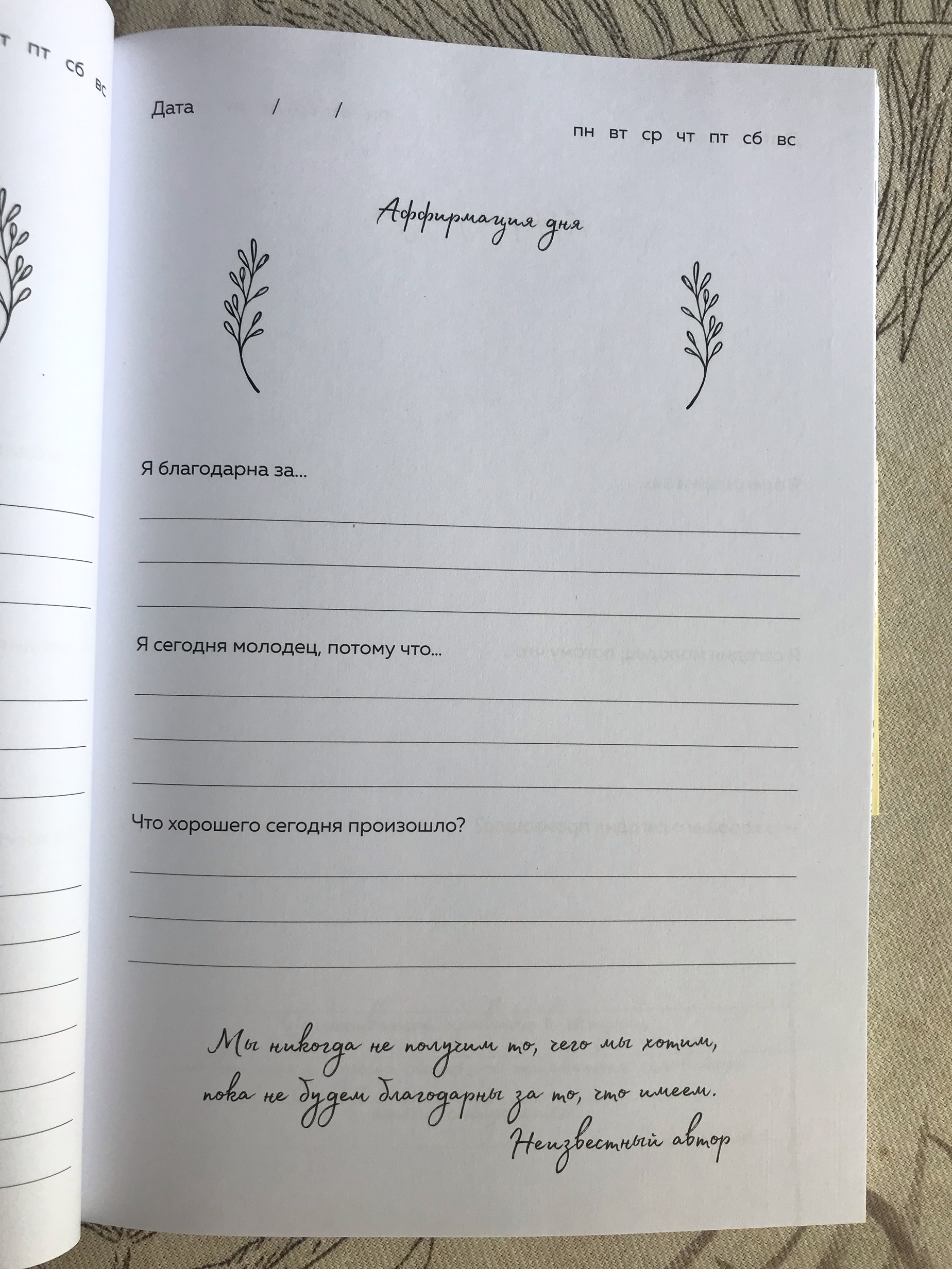 Дневник благодарности – это ежедневная практика любви к себе и миру. Наводящие вопросы и блок для аффирмаций – позитивных установок, помогут выработать привычку видеть хорошее вокруг. Порой стоит притормозить в ежедневной гонке и заметить маленькие радости: чашечка ароматного кофе утром, теплый ветерок в волосах, потрескивание дров в камине или шлейф любимого парфюма.