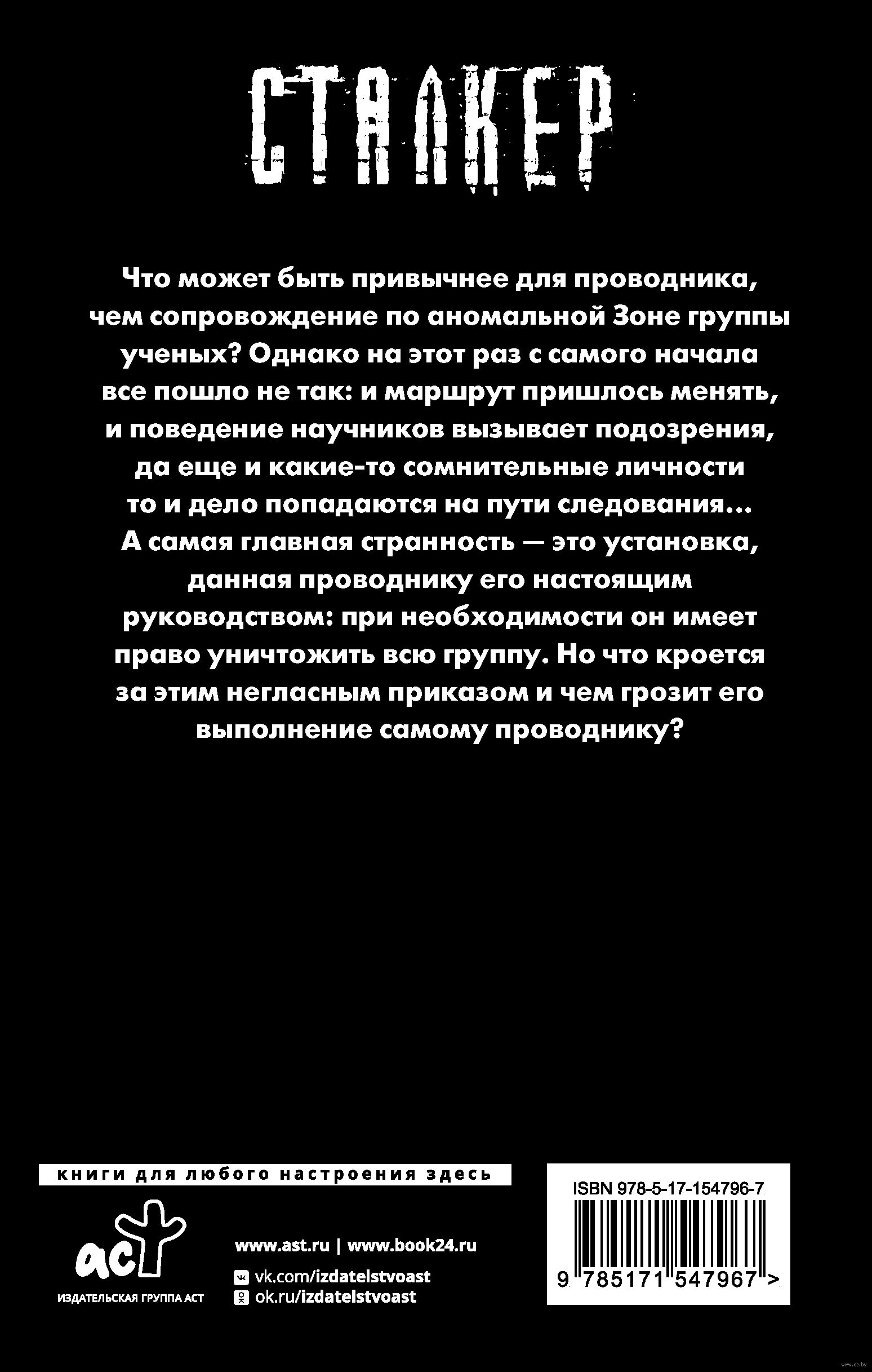 Что может быть привычнее для проводника, чем сопровождение по аномальной Зоне группы ученых? Однако на этот раз с самого начала все пошло не так: и маршрут пришлось менять, и поведение научников вызывает подозрения, да еще и какие-то сомнительные личности то и дело попадаются на пути следования...