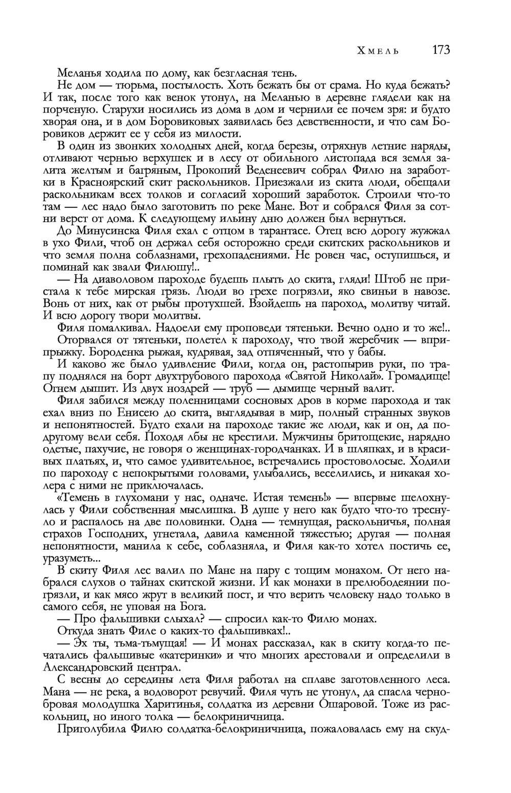 "Хмель" – роман об истории Сибирского края, воссоздает события от восстания декабристов до потрясений начала XX века. "Конь рыжий" повествует о событиях Гражданской войны в Красноярске и Енисейской губернии. В заключительной части "Черный тополь" рассказывается о сибирской деревне двадцатых годов, о периоде Великой Отечественной войны и первых послевоенных годах.