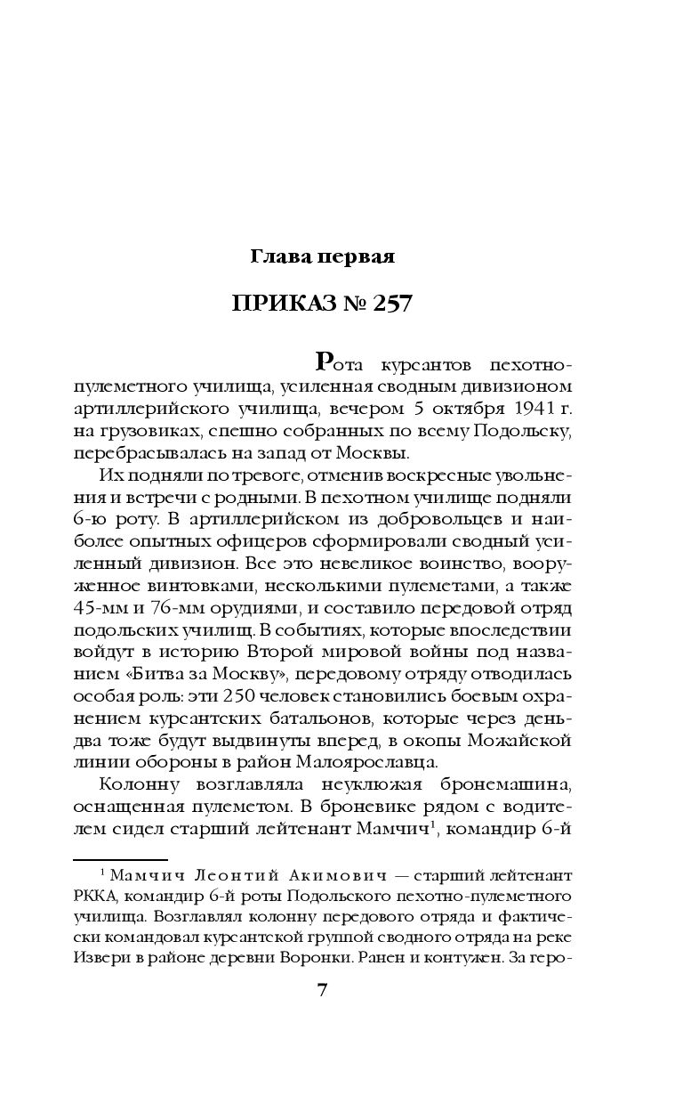 В октябре 1941 г. немцы прорвали линию фронта и рвались к Москве. До столичных окраин остаются считанные километры, когда командование решило ввести в бой отряды, сформированные из курсантов Подольских пехотного и артиллерийского училищ. Десять осенних дней подольские курсанты держали оборону, ожидая подхода подкреплений, выигрывая время ценой собственных жизней, спасая Москву...
