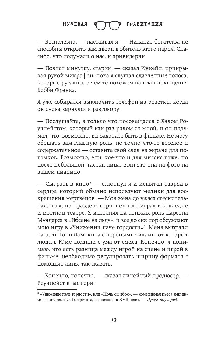 "Нулевая гравитация" – сборник пронзительных и одновременно уморительных рассказов. Они словно крошечные детали в огромном и замысловатом паззле по имени "Вуди Аллен". Через его прозу можно по-новому взглянуть на его фильмы, увидеть новые грани его незаурядного таланта.