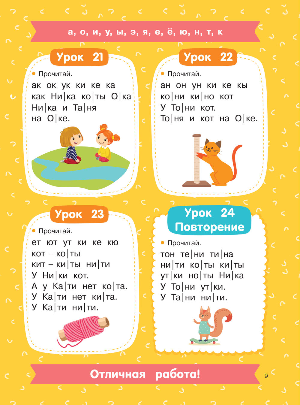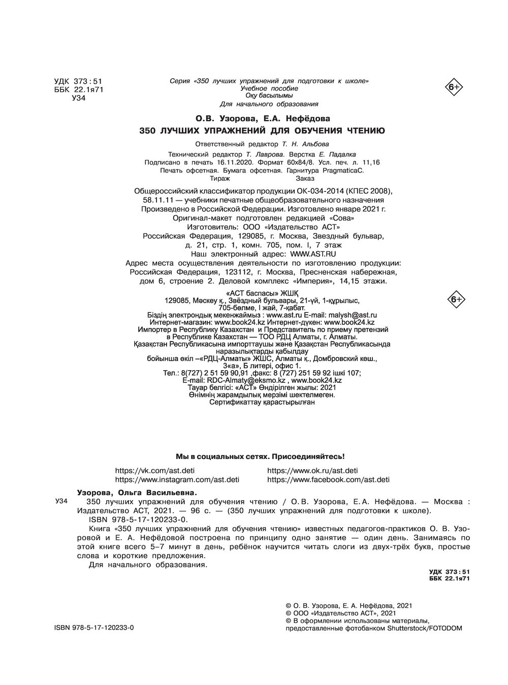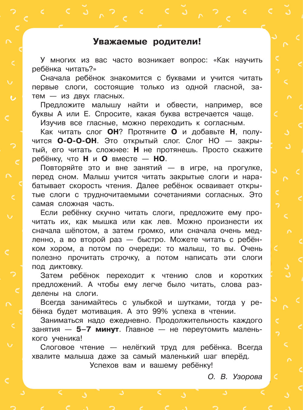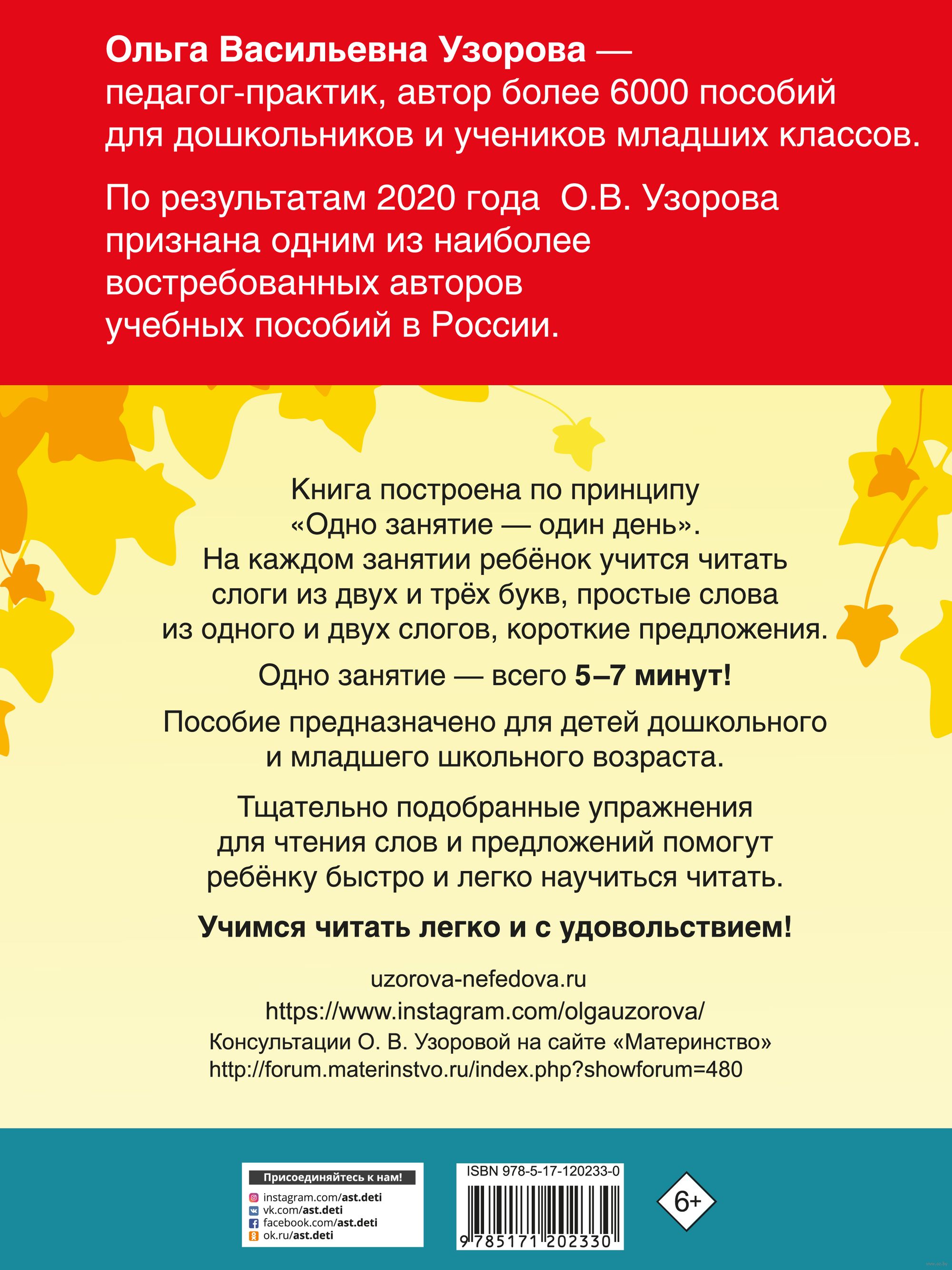 Книга "350 лучших упражнений для обучения чтению" известных педагогов-практиков О. В. Узоровой и Е. А. Нефёдовой построена по принципу одно занятие – один день. Занимаясь по этой книге всего 5-7 минут в день, ребёнок научится читать слоги из двух-трёх букв, простые слова и короткие предложения.