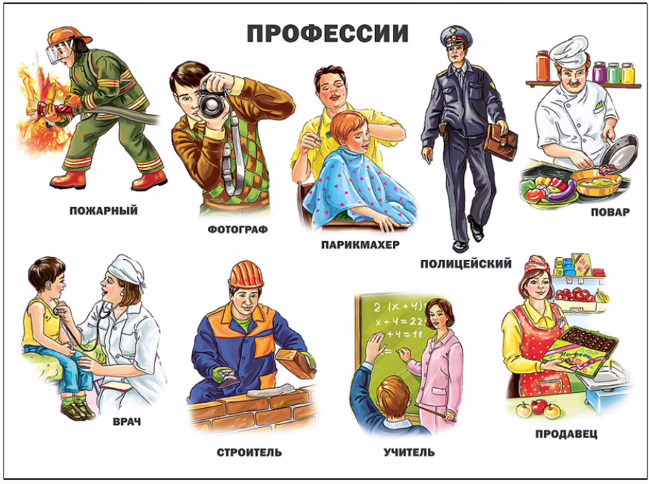 Плакат познакомит ребят с профессиями врача, полицейского, повара, продавца, учителя, парикмахера, строителя, фотографа и пожарного.