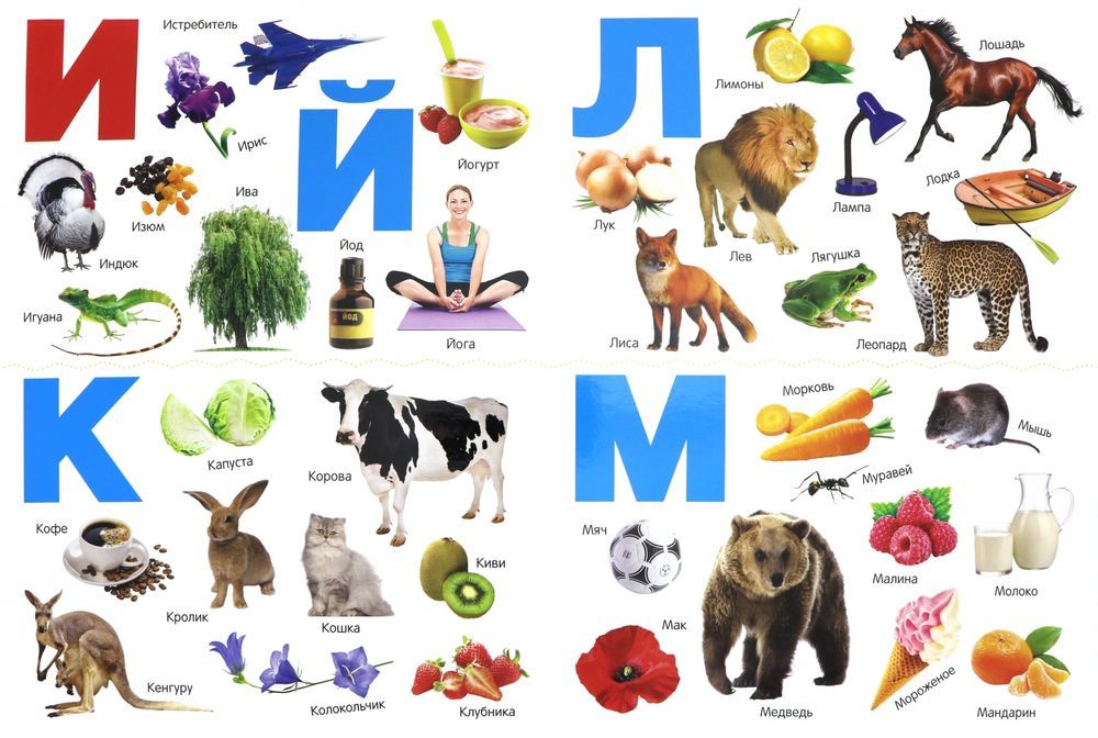 В изучении алфавита ребёнку помогут яркие фотографии зверей, птиц, насекомых, жителей морских глубин, а также транспорта, игрушек и многого другого.