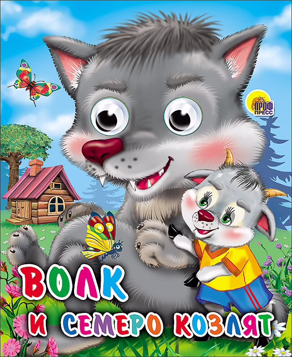 Забавные персонажи сказки "Волк и семеро козлят" с вращающимися глазками и яркие иллюстрации этой книжки не оставят вашего малыша равнодушным и не позволят ему скучать.