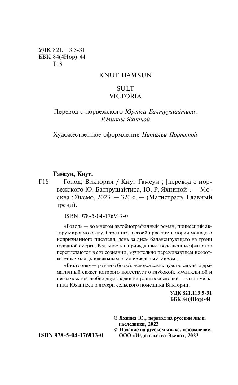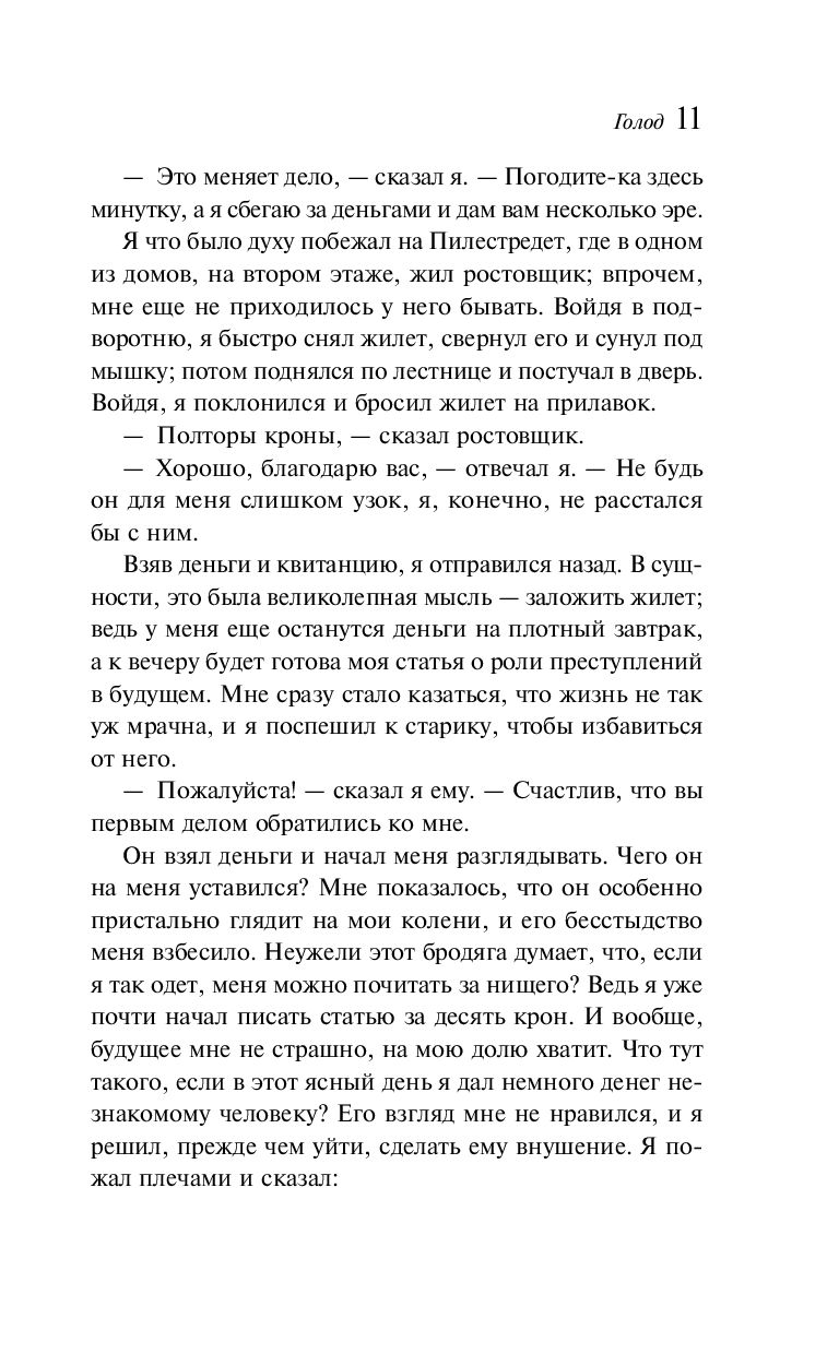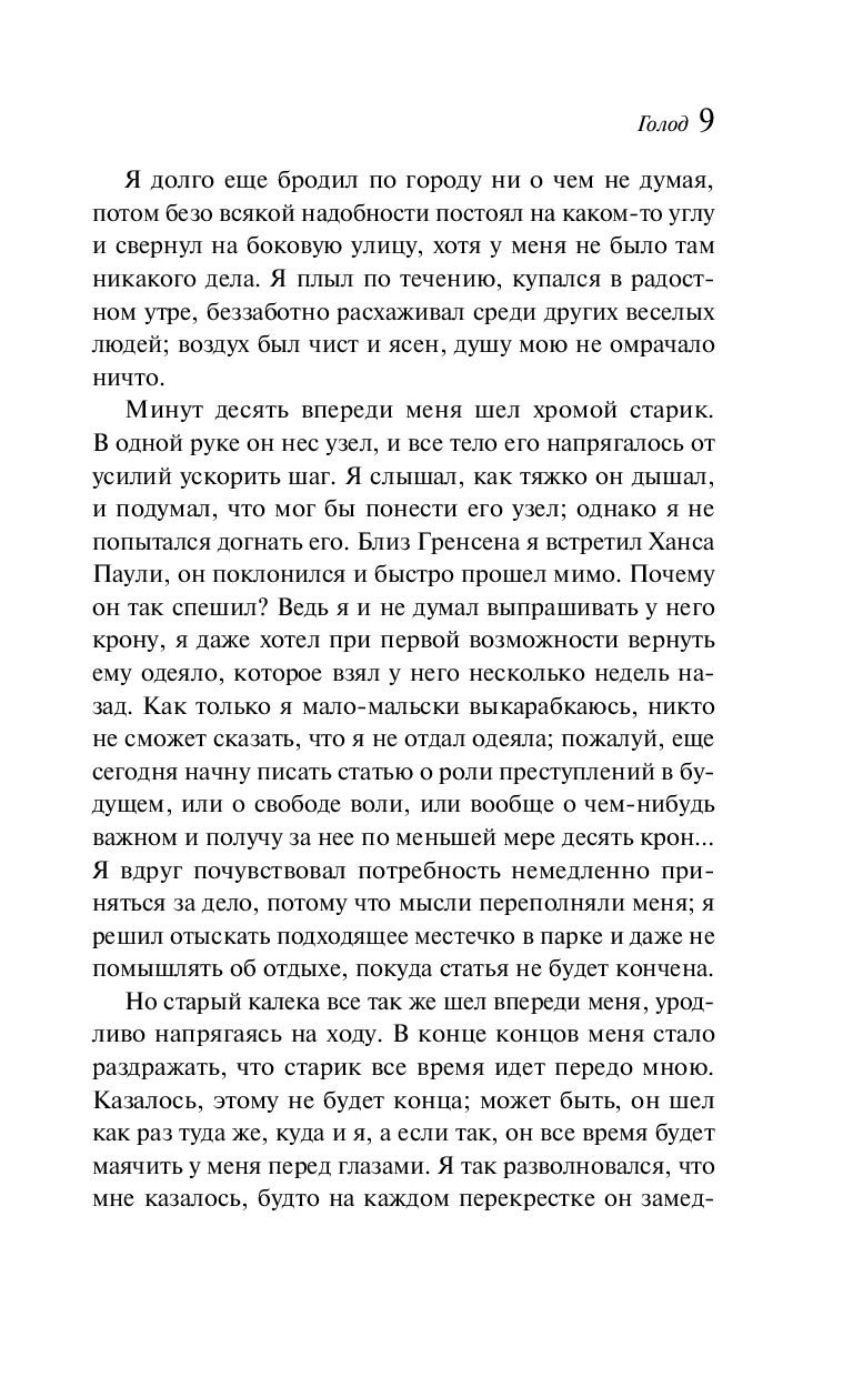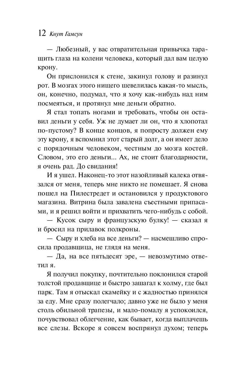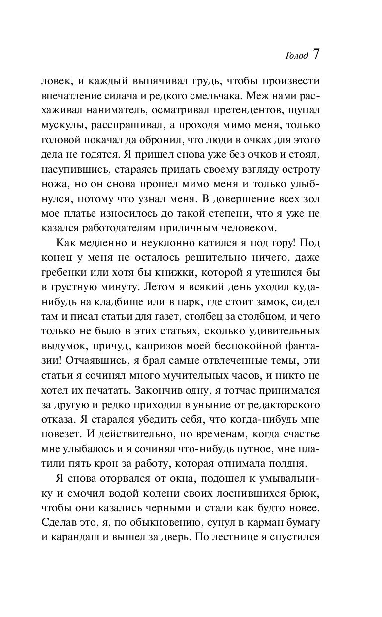 "Голод" – во многом автобиографичный роман, принесший автору мировую славу. Страшная в своей простоте история молодого непризнанного писателя, день за днем балансирующего на грани голодной смерти. Реальность и причудливые, болезненные фантазии переплетаются в его сознании, мучительно переживающем несоответствие между идеальным и материальным миром...