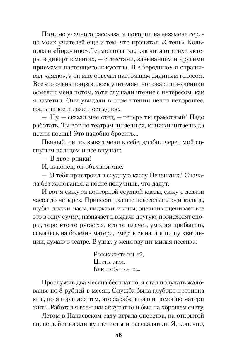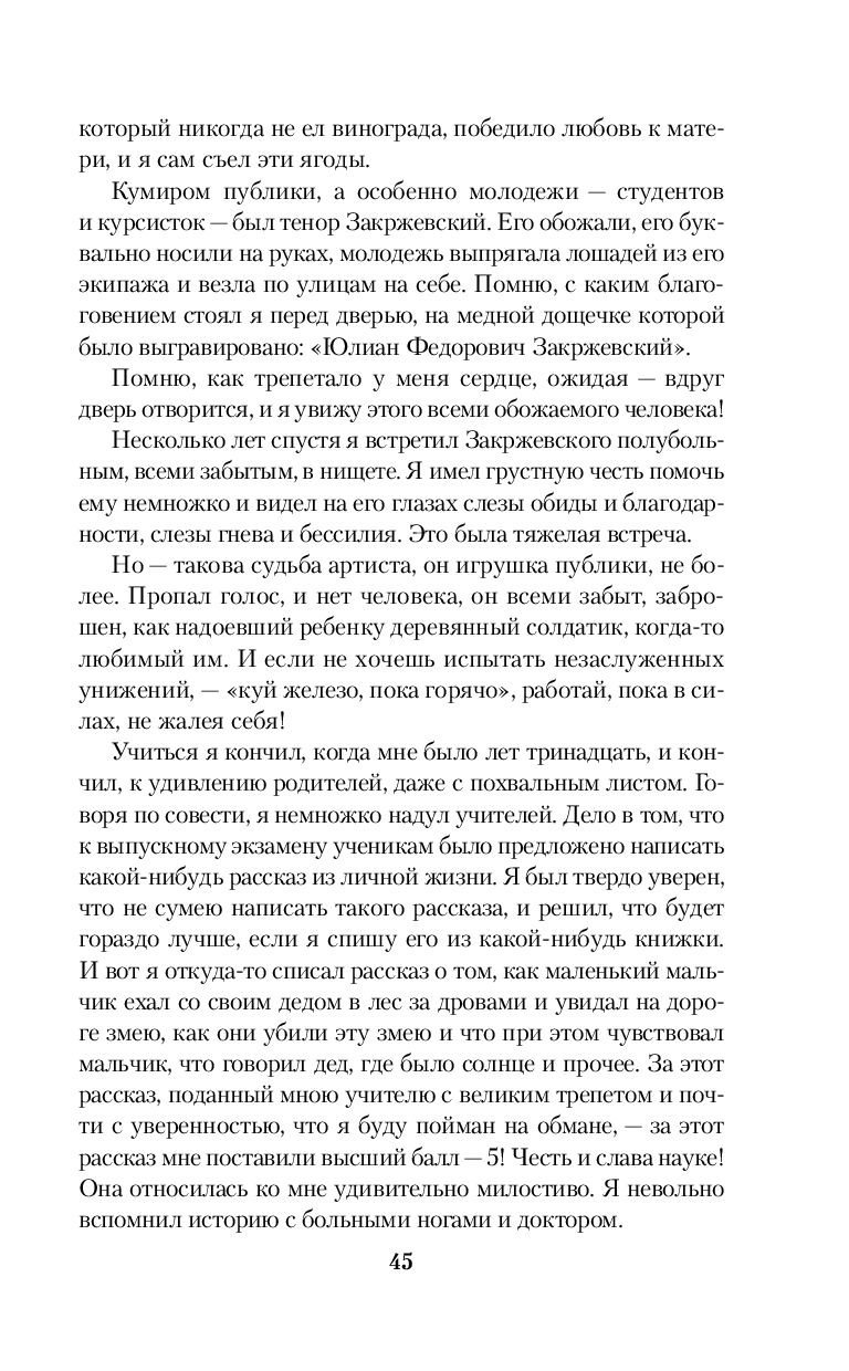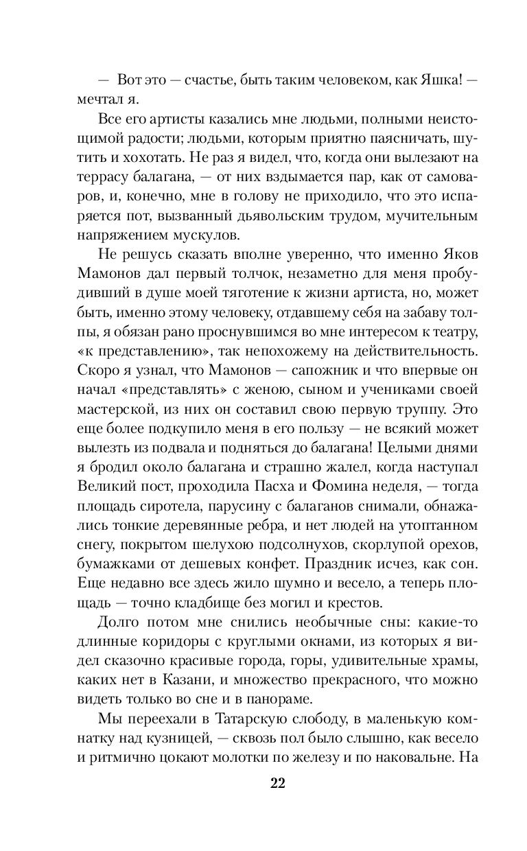 В своей автобиографии Шаляпин рассказывает о своей непростой жизни, пути на большую сцену, о том, что подтолкнуло его к этому выбору, как проходило становление на сцене, делится мыслями о Родине, театре, опере, большевиках и соотечественниках. Интересны мысли великого певца и выступлениях в России и за границей, а также впечатления о встречах с Лениным и Троцким, Горьким и Толстым, Репиным и Серовым, Гербертом Уэллсом и Бернардом Шоу.