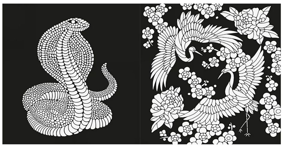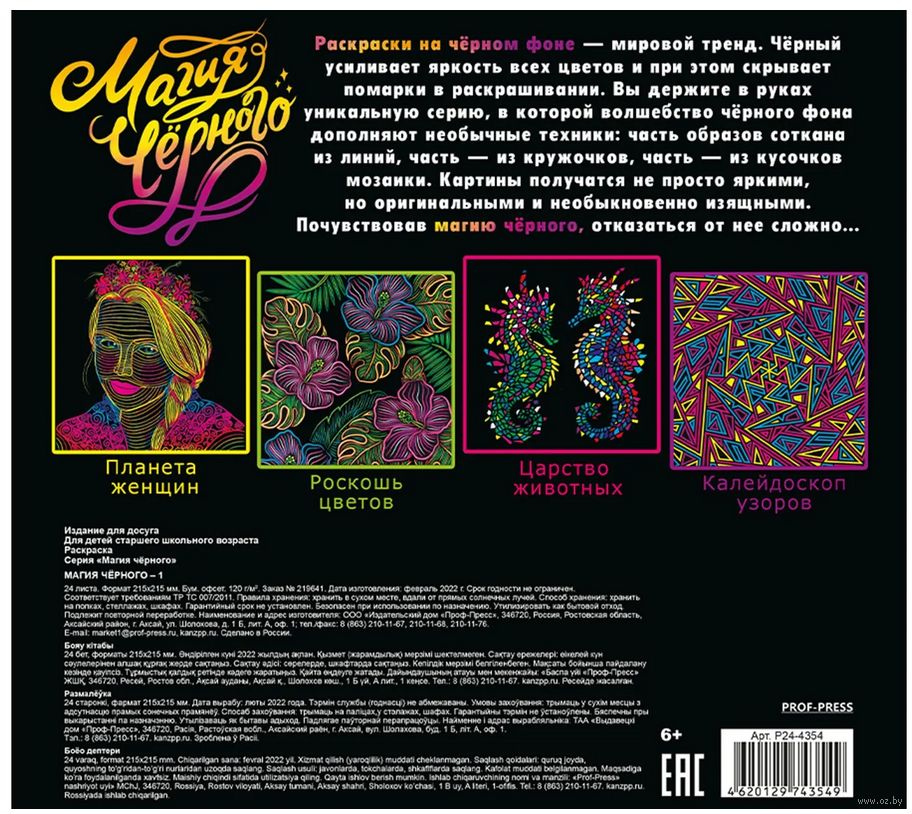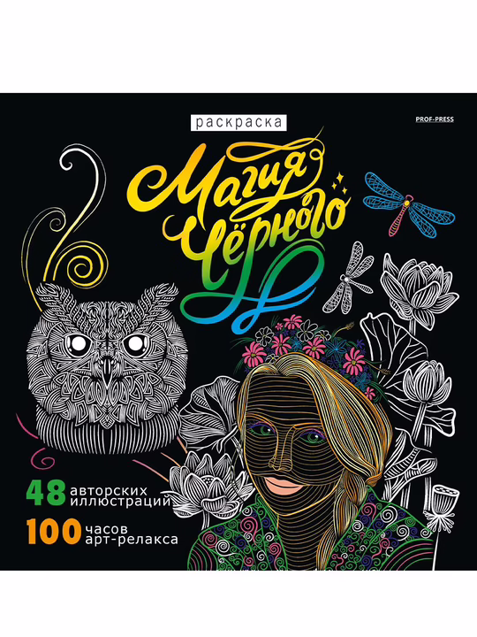 Раскраски на чёрном фоне – мировой тренд. Чёрный усиливает яркость всех цветов и при этом скрывает помарки в раскрашивании. Вы держите в руках уникальную серию, в которой волшебство чёрного фона дополняет необычная техника – часть образов соткана из линий, часть из – кружочков, часть – из кусочков мозаики. Картины получатся не просто яркими, но оригинальными и необыкновенно изящными. Почувствовав магию чёрного, отказаться от неё сложно. Для ювелирной точности раскрашивания рекомендуется использовать гелевые ручки, линеры и роллеры. Для облегчённого варианта подойдут фломастеры на водной основе – ими можно заполнять одним цветом сразу несколько соседних линий.