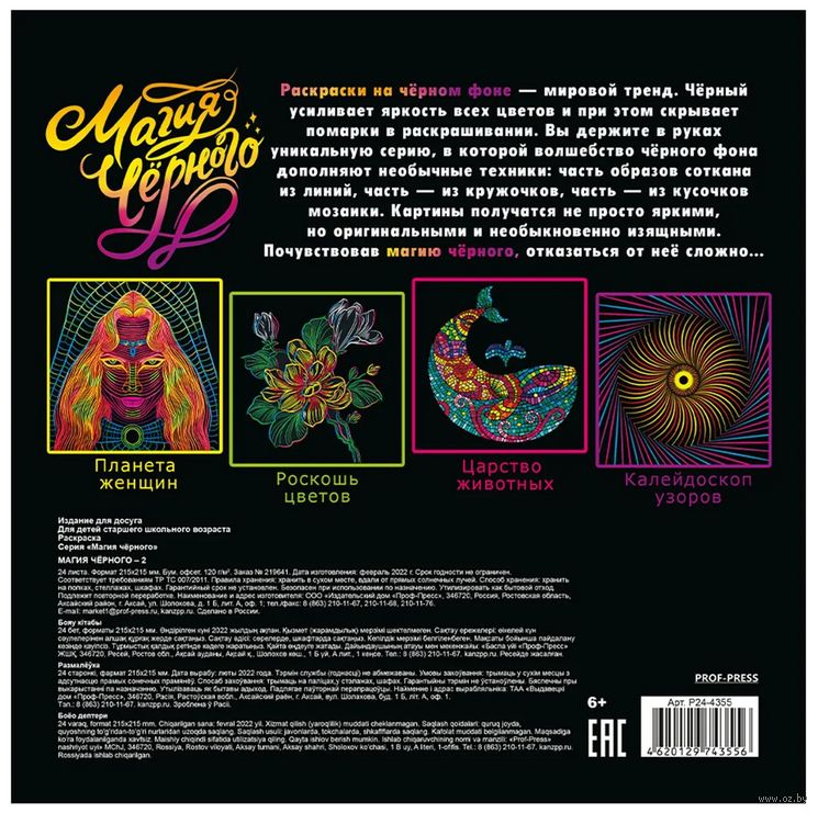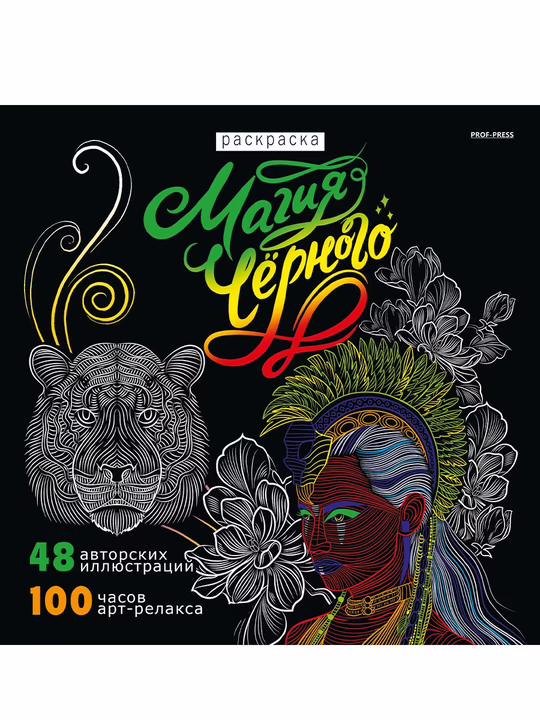 Раскраски на чёрном фоне – мировой тренд. Чёрный усиливает яркость всех цветов и при этом скрывает помарки в раскрашивании. Вы держите в руках уникальную серию, в которой волшебство чёрного фона дополняет необычная техника – часть образов соткана из линий, часть из – кружочков, часть – из кусочков мозаики. Картины получатся не просто яркими, но оригинальными и необыкновенно изящными. Почувствовав магию чёрного, отказаться от неё сложно. Для ювелирной точности раскрашивания рекомендуется использовать гелевые ручки, линеры и роллеры. Для облегчённого варианта подойдут фломастеры на водной основе – ими можно заполнять одним цветом сразу несколько соседних линий.