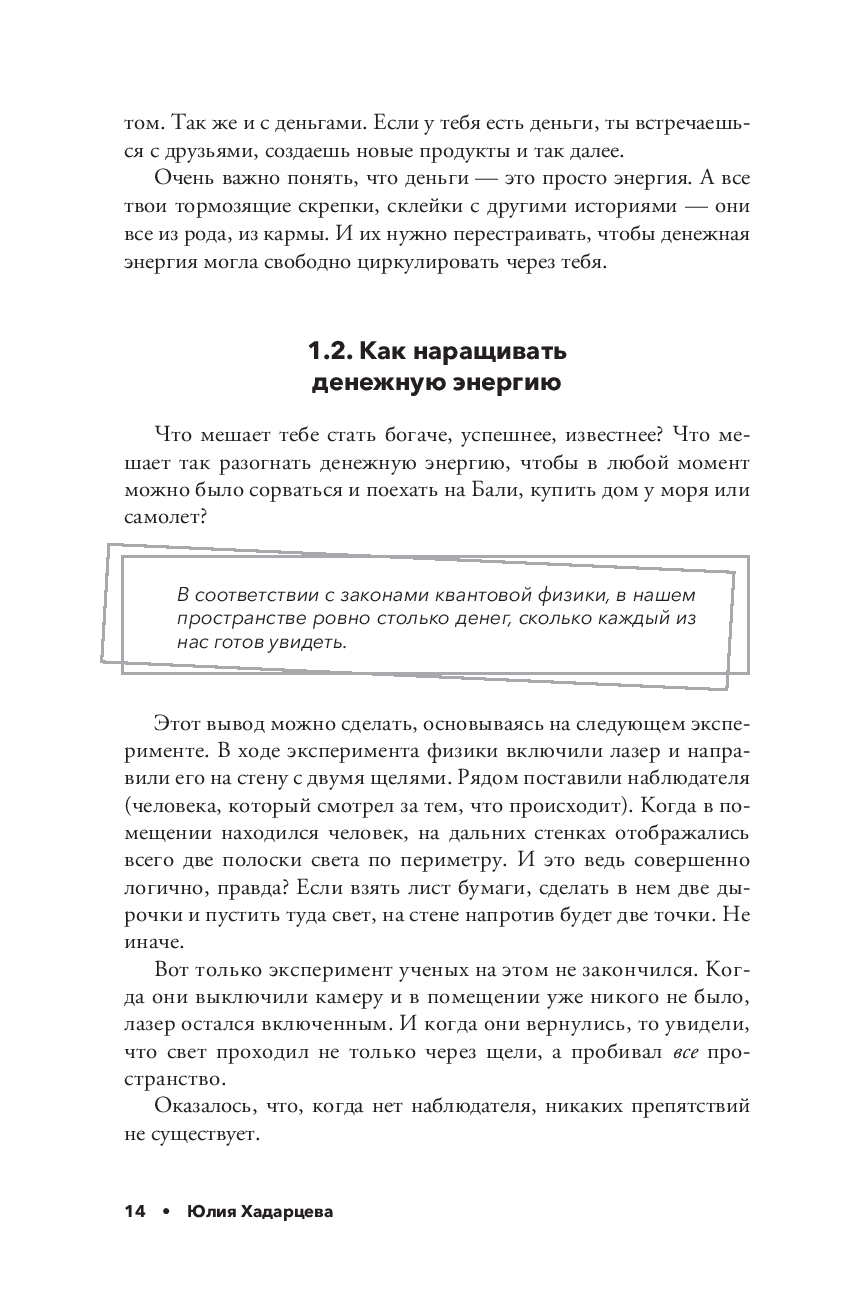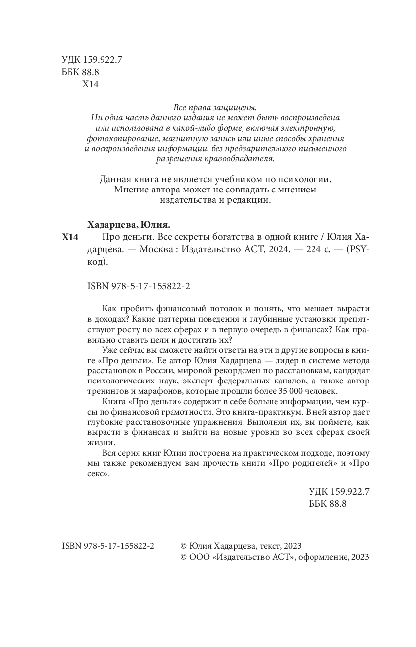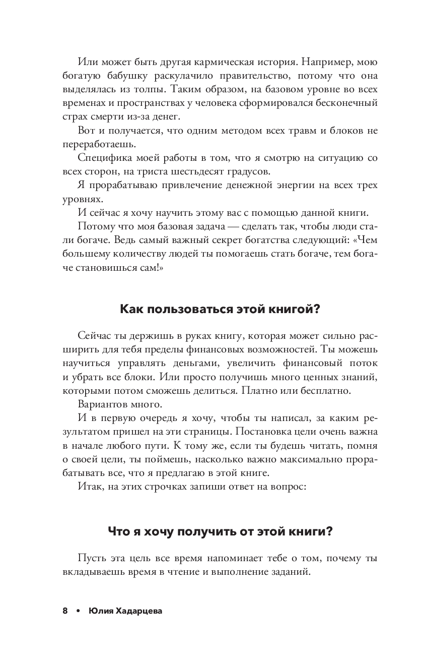 Уже сейчас вы сможете найти ответы на эти и другие вопросы в книге "Про деньги". Ее автор Юлия Хадарцева – лидер в системе метода расстановок в России, мировой рекордсмен по расстановкам, кандидат психологических наук, эксперт федеральных каналов, а также автор тренингов и марафонов, которые прошли более 35 000 человек.