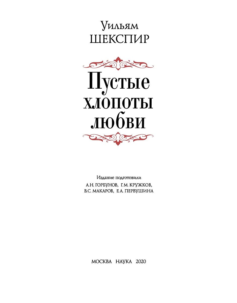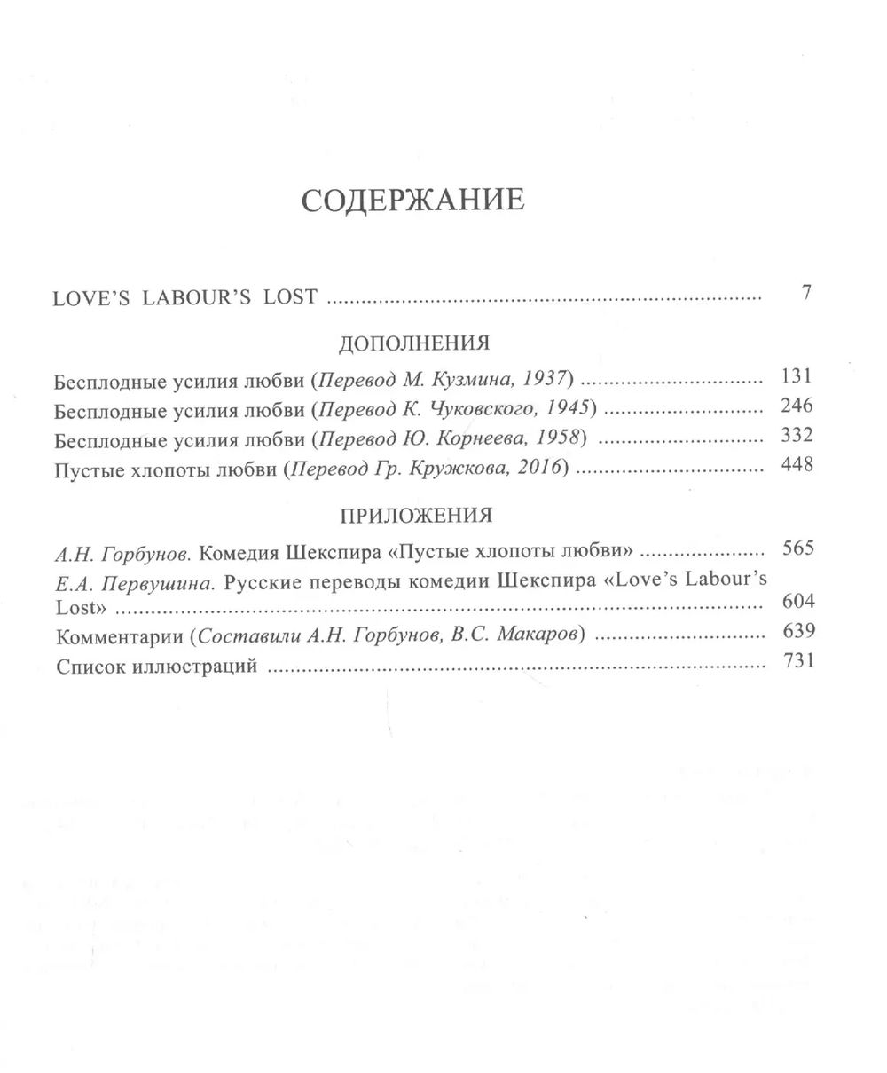 "Пустые хлопоты любви" (Loveʼs Labourʼs Lost) – ранняя комедия Шекспира, изданная и поставленная на сцене при жизни автора, затем забытая на два столетия и лишь в ХХ в. оценённая по достоинству. Пьеса печатается на языке оригинала в сопровождении четырёх выдающихся переводов: М. Кузмина (1937), ни разу не переиздававшегося перевода К. Чуковского (1945), Ю. Корнеева (1958) и Гр. Кружкова (2016). Издание снабжено обширным научным комментарием и редкими иллюстрациями.