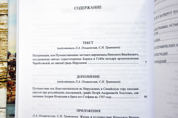 В издании помещён текст путевых записок черниговского иеромонаха Ипполита Вишенского, совершившего в начале XVIII в. хождение в Святую землю и описавшего крупнейшие центры православного мира: Константинополь, Иерусалим и Палестину, Египет и Синай, Сирию и Афон. Автор следует традиции средневековой паломнической литературы, обогащая её новациями украинской барочной культуры. По богатству исторического материала и художественной выразительности описаний этот памятник находится в ряду лучших произведений путевой литературы Петровского времени. Для сравнения в книге помещено "Хождение" Андрея Игнатьева, совершившего вместе с Ипполитом Вишенским путешествие по Египту и Синаю. Новое издание "Пелгримации", в основе которого лежит единственный сохранившийся список (РНБ. Собр. М. П. Погодина. № 1544), вызвано труднодоступностью и несовершенством двух предыдущих публикаций, осуществленных в 1876 г. архимандритом Леонидом (Кавелиным) и в 1914 г. С. П. Розановым.