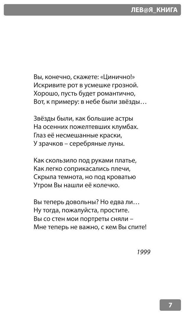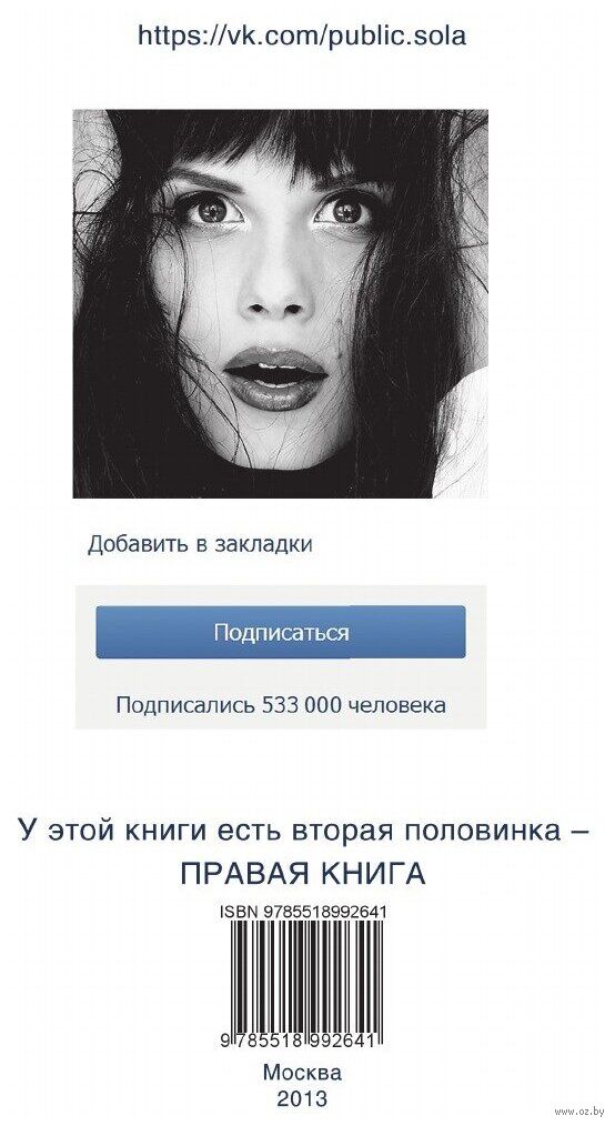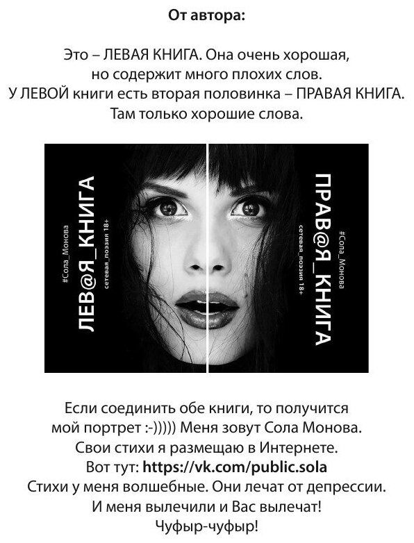 Сола Монова откровенно эпатировала публику в своем поэтическом блоге ВКонтакте и собрала более 200 000 фолловеров. "Ты не бойся, мне ведь не пятнадцать – ухожу я профессионально", "Овечки грустят на девичьих трусиках – никто не считает теперь в уме их", "А Алеша замечательный, только пьющий. Не влюбляйся окончательно – будут лучше", – в этом сборнике смертельная доза сарказма и нецензурной лексики. Левую Книгу лучше читать в глубокой депрессии в одинокий День святого Валентина. Оригинальный подарок подруге на годовщину развода. У Левой книги есть вторая половинка – Правая Книга. Соединив обе, вы получите портрет автора.