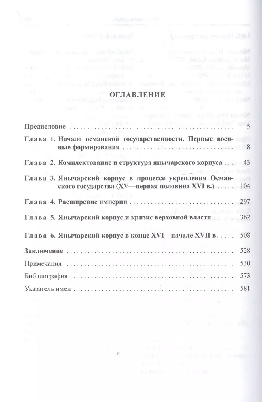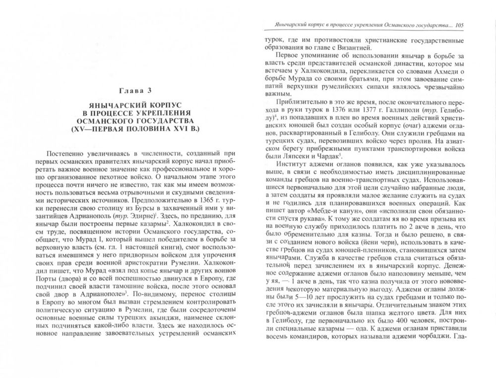 Книга рассказывает об истории янычарского корпуса, правилах и нормах его комплектования и существования, а также той роли, которую сыграли янычары как в военных, так и во внутриполитических событиях Османской империи. В монографии показаны фундаментальные особенности функционирования османской государственности, её тесная связь с политикой войн и территориальной экспансии, влияние исламского фактора, а также значительная роль янычарского войска в формировании внешней и внутренней политики турецких султанов. История янычарского корпуса рассмотрена в книге на фоне военных событий XV-начала XVII в., результатом которых стали заметное ослабление османской военной державы и упадок самого янычарского корпуса как военного института. История янычар представлена автором как часть социальной истории Османского государства, что важно для воссоздания более полной общественно-политической и этнографической картины средневековой жизни турок.