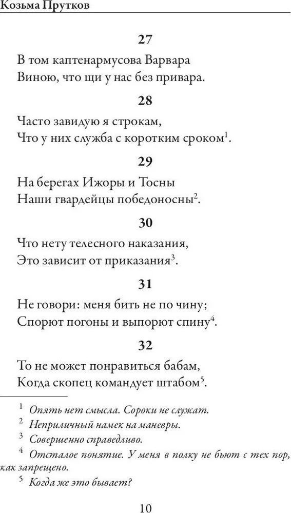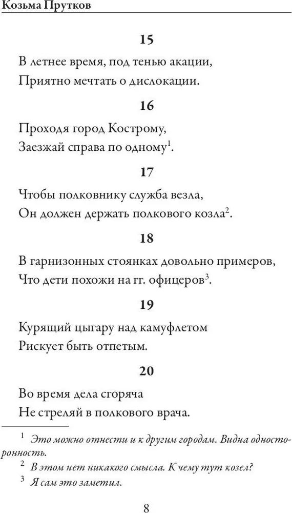 В издание вошли многообразные литературные опыты "проблемного" автора – Козьмы Пруткова: афоризмы, комедии и злободневные анекдоты. Почему "проблемный"? В 1850-60-е годы за литературной маской скрывались четыре автора – Алексей Толстой, Алексей, Владимир и Александр Жемчужниковы. Так на страницах журналов "Современник" и "Искра" возник во всем великолепии Козьма Прутков. Его острая сатира никого не оставит равнодушным.