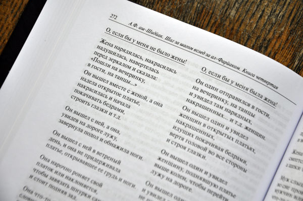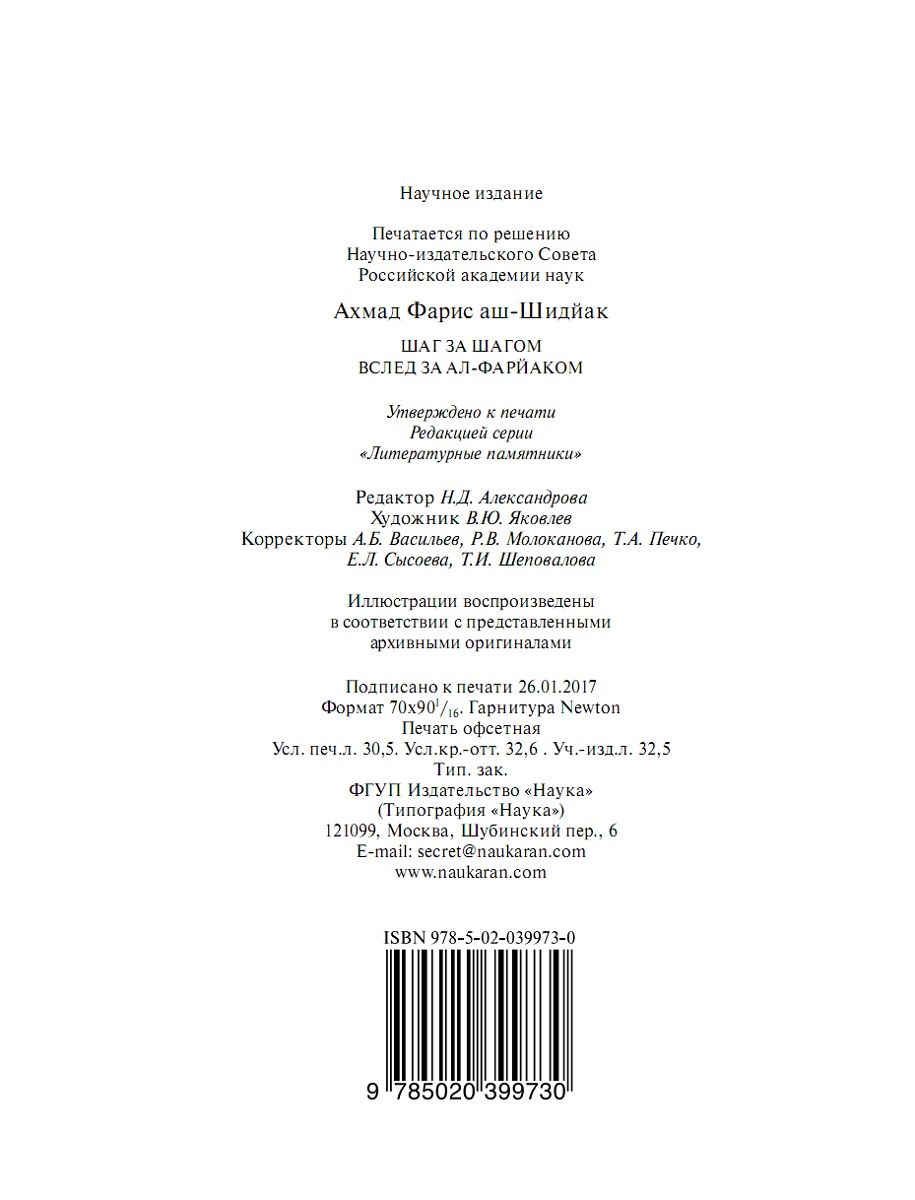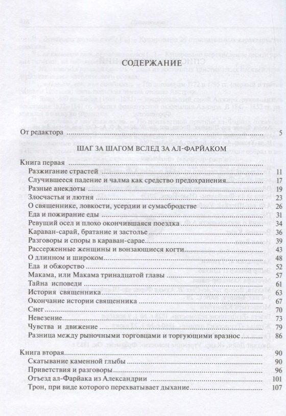 Прозаик, поэт, лингвист, переводчик, журналист, издатель, один из зачинателей современного арабского романа Ахмад Фарис аш-Шидйак (ок. 1804–1887) принадлежит к поколению литераторов-просветителей, писавших на арабском языке в середине XIX в. В книге переплелись традиции восточной и европейской литератур. Аш-Шидйак отдаёт дань традиционным жанрам рйхла (описание путешествия), макама (плутовская новелла) классической арабской литературы, а также сатире Рабле, Стерна, Свифта и романтическому живописанию в духе Ламартина и Шатобриана. Автор провозглашает две главные цели своей книги: познакомить читателя с диковинками (гара'иб) и редкостными оборотами (навадир) арабского языка; воспеть женщин, показать все их достоинства и недостатки. Истолкование названия книги аш-Шидйака "Ас-Сак 'ала ас-сак фи ма хува ал-Фарйак" как "Шаг за шагом вслед за ал-Фарйаком" принадлежит А. Е. Крымскому. Здесь впервые публикуется русский перевод романа, который специально для серии "Литературные памятники" выполнила В. Н. Кирпиченко.