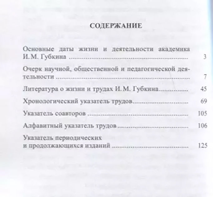 Выпуск посвящён академику И. М. Губкину – выдающемуся русскому учёному-геологу, основателю советской нефтегазовой геологии, организатору высшего нефтяного образования, видному государственному и общественному деятелю. Содержит основные даты жизни и деятельности И. М. Губкина, очерк научной, общественной и педагогической деятельности учёного, литературу о нём и его трудах, хронологический указатель трудов, а также вспомогательные указатели.
