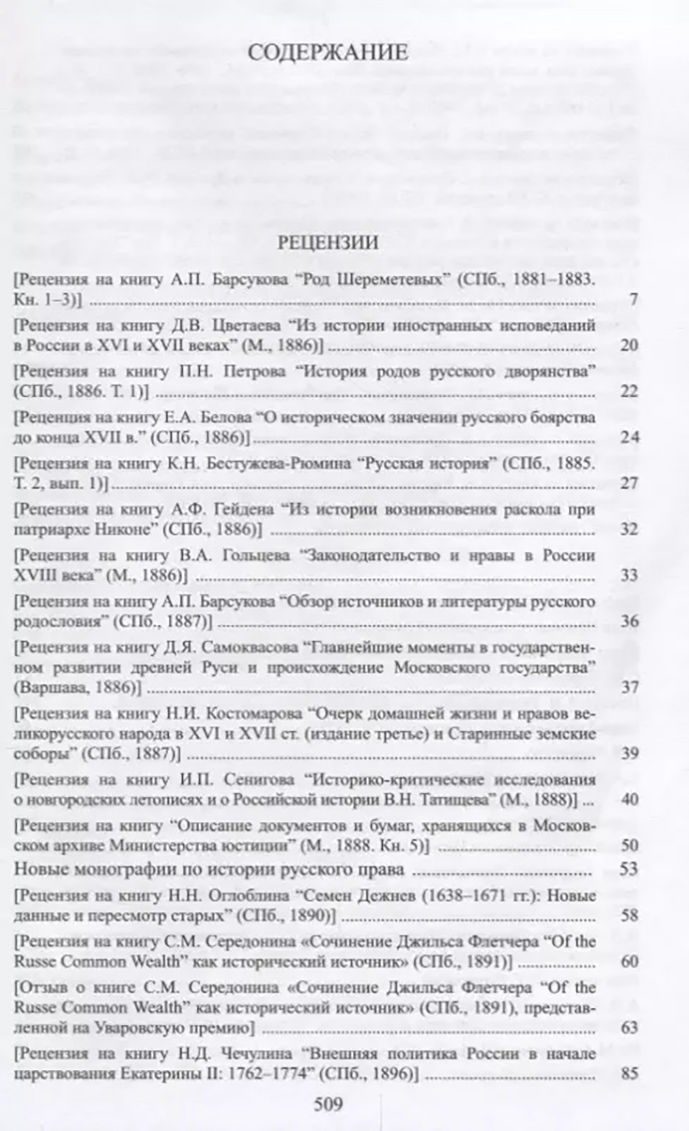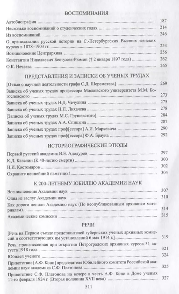 Основное содержание тома составляют историографические и мемуарные произведения. Среди них избранные рецензии и отзывы на научные труды историков конца XIX – начала XX в., некрологи, воспоминания, речи, а также историографические этюды, посвящённые деятелям русской культуры В. Е. Адодурову, К. Д. Кавелину, Н. И. Костомарову, 200-летнему юбилею Академии наук. В томе представлены также специальные лекционные курсы, читанные С. Ф. Платоновым в Петербургском археологическом институте.