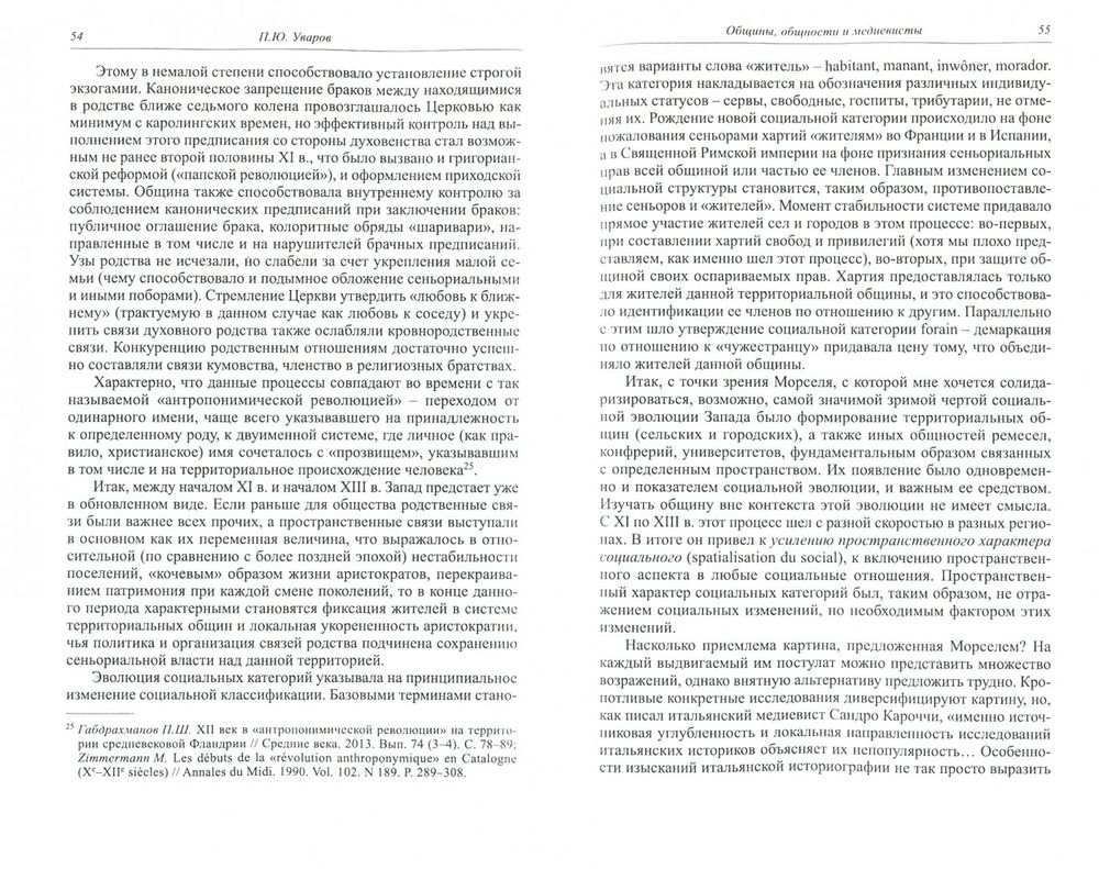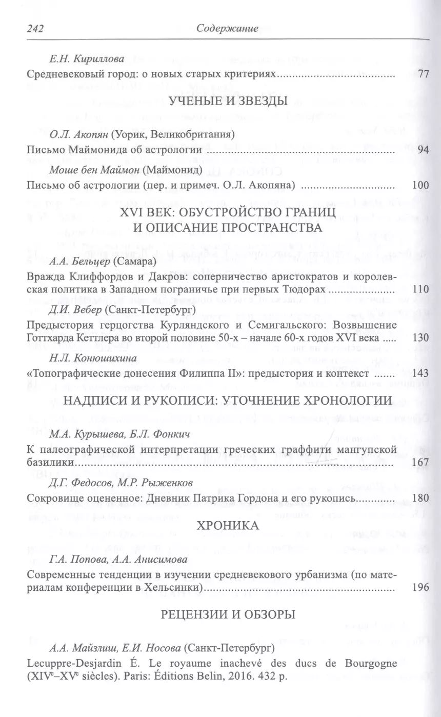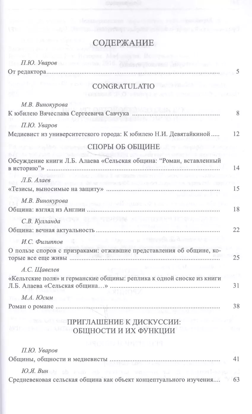В данном выпуске центральной проблемой является традиционный для отечественной историографии вопрос об общине и, шире, общностях в Средние века. Этому посвящена публикация материалов обсуждения книги Л. Б. Алаева и его полемических тезисов. Раздел "Приглашение к дискуссии" продолжает обсуждение подобной проблематики на примере средневековых ремесленных объединений и различного рода "территориальных общин". Особый блок составляют статьи, посвящённые обустройству границ и описанию пространства в XVI в.: англо-шотландское пограничье, кристаллизация герцогства Курляндского, донесения, содержащие описания территорий испанских королей. Издание содержит комментированную публикацию астрологического трактата Моисея Маймонида.