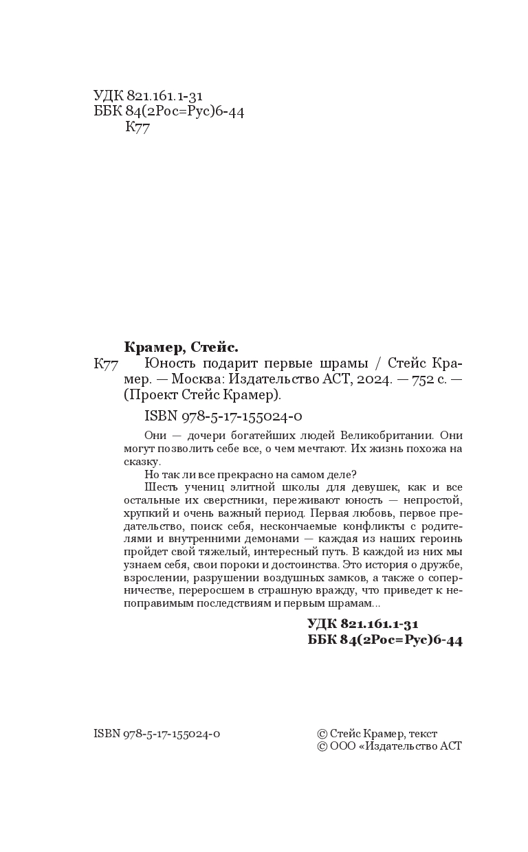 Однозначно я бы порекомендовала к прочтению эту книгу тем, кто читал предыдущие работы Стейс Крамер. В частности её бестселлер "50 ДДМС". Явно заметна разница. Анастасия, как мне кажется, учла свои предыдущие ошибки. Некоторые сюжетные повороты предсказуемы, однако история остаётся очень интересной. Наглядно показано, как многолетняя дружба рушится всего за пару месяцев (что часто бывает и в жизни), и все задумываются: а была ли вообще дружба? Возможно, вы даже увидите свои проблемы и переживания в одной из героинь. Во время чтения, особенно в начале, атмосфера моментами напоминала "Общество мёртвых поэтов". Не могу сказать, что книга - идеал, но точно не должна разочаровать!