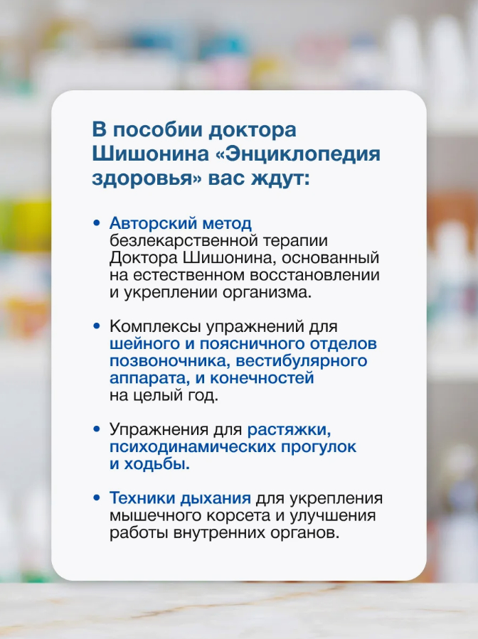 Новая книга доктора Шишонина – это сборник упражнений на целый год для укрепления вашего организма. В книге вы найдете комплексы для позвоночника, суставов, вестибулярного аппарата, гимнастику для дыхания и шеи, а также упражнения по психодинамической ходьбе и растяжке. Все методики, представленные в книге, дополняют друг друга, позволяя сочетать различные упражнения между собой.