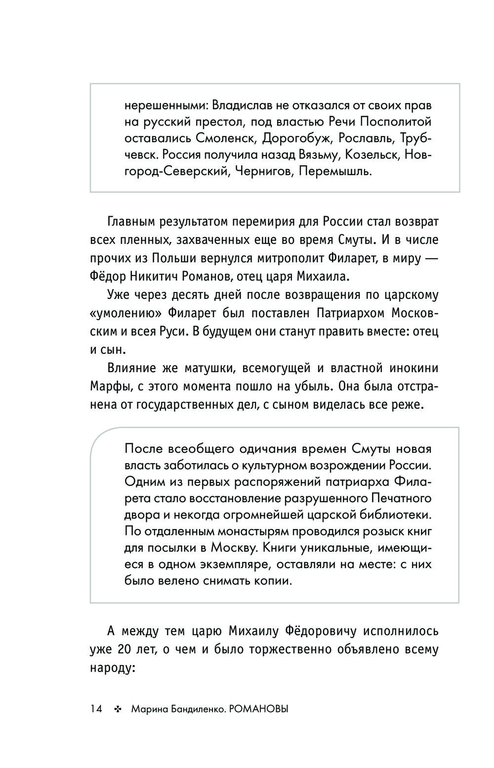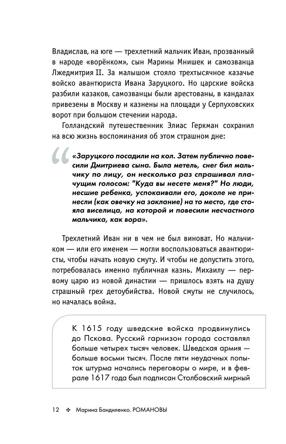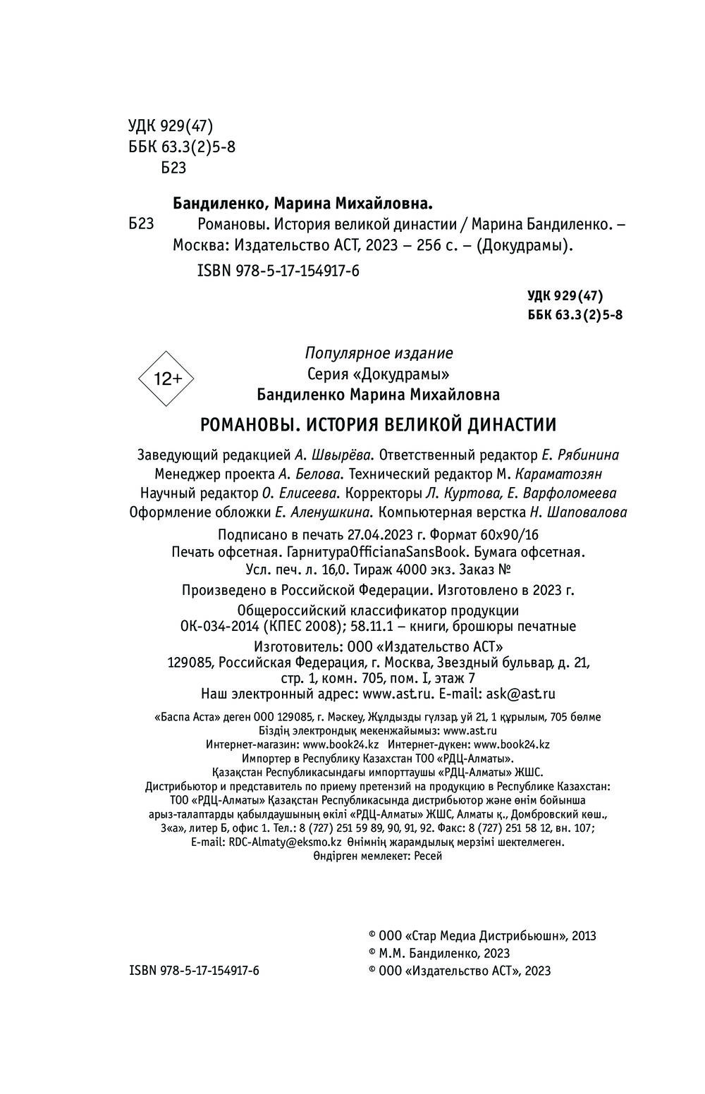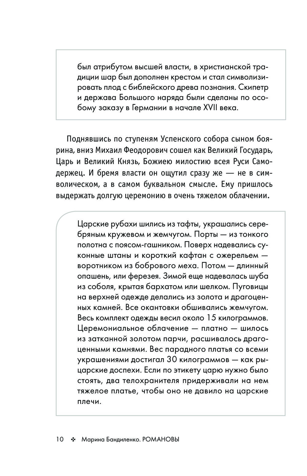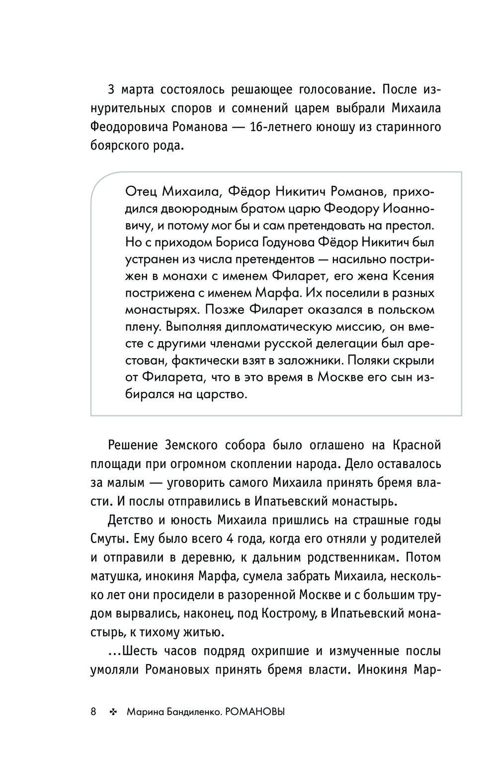 Автор, сценарист, кандидат исторических наук, Марина Бандиленко, проделала уникальную работу по переработке текста сценария популярного документального сериала "Романовы", дополнив его новыми любопытными фактами и цитатами из исторических источников, которые не попали на экран.
