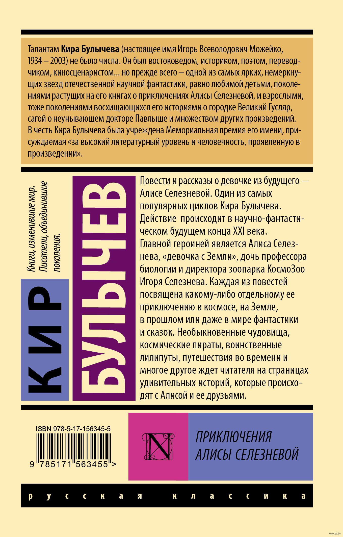 Повести и рассказы о девочке из будущего – Алисе Селезнёвой. Один из самых популярных циклов Кира Булычёва. Действие происходит в научно-фантастическом будущем конца XXI века. Главной героиней является Алиса Селезнёва, "девочка с Земли", дочь профессора биологии и директора зоопарка КосмоЗоо Игоря Селезнёва. Каждая из повестей посвящена какому-либо отдельному её приключению в космосе, на Земле, в прошлом или даже в мире фантастики и сказок. Необыкновенные чудовища, космические пираты, воинственные лилипуты, путешествия во времени и многое другое ждет читателя на страницах удивительных историй, которые происходят с Алисой и её друзьями.